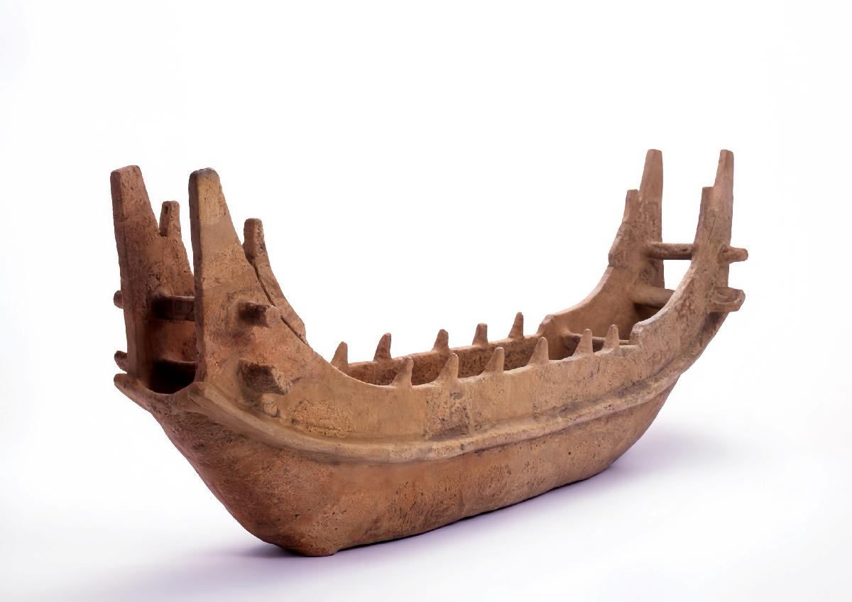 展覽中最引人注目的焦點之一,是長達1公尺的船形埴輪複製品。其原件為日本重要文化財,重現了5世紀的精湛航海技術,更被視為一艘「靈魂渡船」,承載墓主航向來世,與臺灣十三行文化中的貝器貿易形成深刻呼應,訴說著海洋文化的生死觀與交流意涵。另一件焦點文物—盤龍鏡,鏡背龍紋與「景初四年」銘文,暗藏著跨國工匠的歷史謎團,錯置的年號揭露了三國時代中日交流的鮮活證據。來自南方海域的貝鐲,以珍稀的闊唇鳳凰螺材質,則見證了日本九州權力階層如何透過物質交換鞏固地位。此外,還首次展出乳藍色玻璃珠飾、方格印紋圜底罐、圈足罐等11件十三行遺址出土文物,以及青銅刀柄、駱駝銅牌、南瓜瓣陶壺等重要古物也同時亮相,為觀眾帶來豐富的文化體驗。