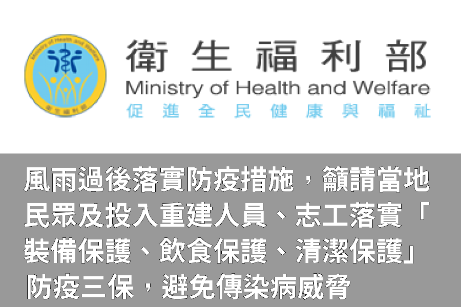 疾病管制署(下稱疾管署)今(27)日表示,樺加沙颱風造成花蓮光復鄉嚴重災情,考量災時強風暴雨造成嚴重積淹水,可能造成生態環境損害及飲用水受汙染,加上災後污水、污泥或災害廢棄物尚未清除完成,災區仍有短暫陣雨發生,可能增加類鼻疽、鉤端螺旋體病及腸胃炎等傳染病發生風險,提醒當地民眾及投入重建人員、志工,清理環境時落實「裝備保護、飲食保護、清潔保護」防疫三保,避免傳染病威脅。