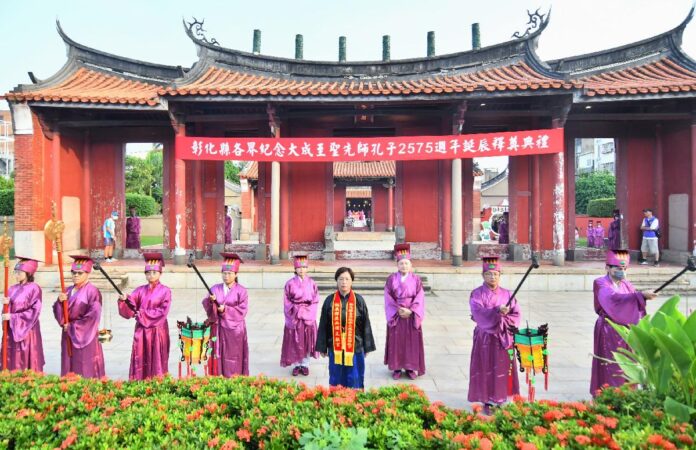為紀念至聖先師孔子2575週年誕辰,今(28)日教師節於彰化孔子廟隆重舉行釋奠典禮,典禮由縣長王惠美擔任正獻官,並邀請今年師鐸獎得主擔任分獻官,全程依循古制,包含獻六佾舞、行亞、終獻禮,行禮如儀、場面莊重。王縣長盼藉典禮感念至聖先師孔子之餘,感謝所有老師無私無我付出,讓孩子們能夠開心學習、快樂成長,為國家培育出更多優秀英才。