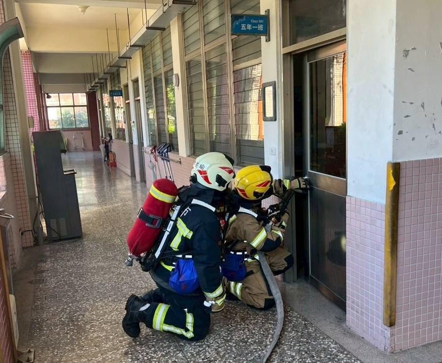 演練過程中,現場指揮官派遣不同分隊進行鐵捲門與教室門的破壞作業,展開滅火攻擊。各分隊人員彼此協調合作,順利完成火場搜索與滅火搶救,共同完成本次演練。