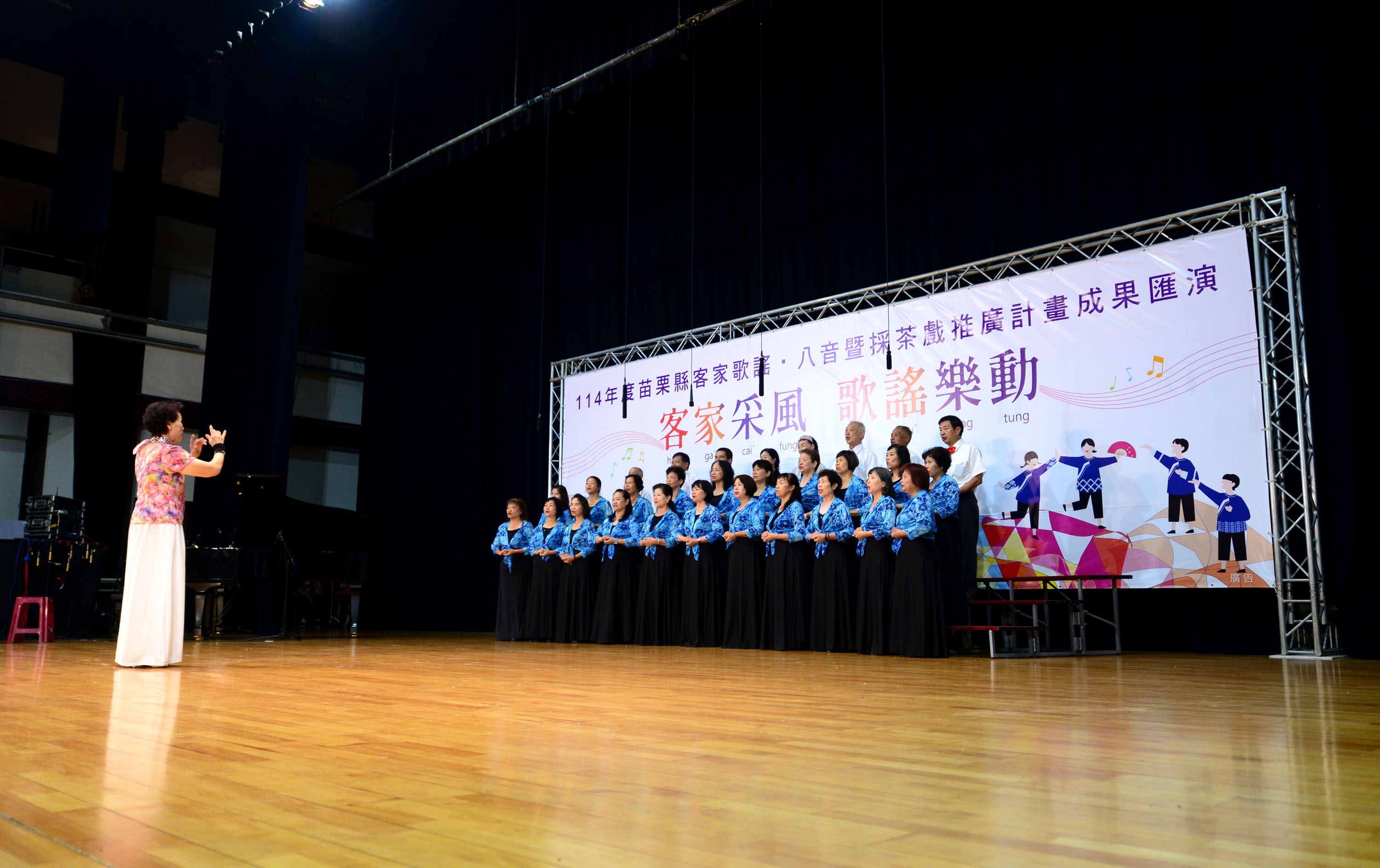 為展現114年度推動客家歌謠、八音暨採茶戲計畫成果,縣府文化觀光局9月27、28日在中正堂舉辦4場次成果匯演,今年的匯演團隊,除了縣內客家歌謠班28隊、採茶戲班2隊及八音班2隊展現教學成果演出外,並特地邀請新竹縣寶山鄉客家民謠研究協會、桃園市陂塘之聲合唱團及新竹市客家文化發展協會來苗共襄盛舉,希望透過跨縣市交流,快樂傳唱「共下傳承」客家文化。