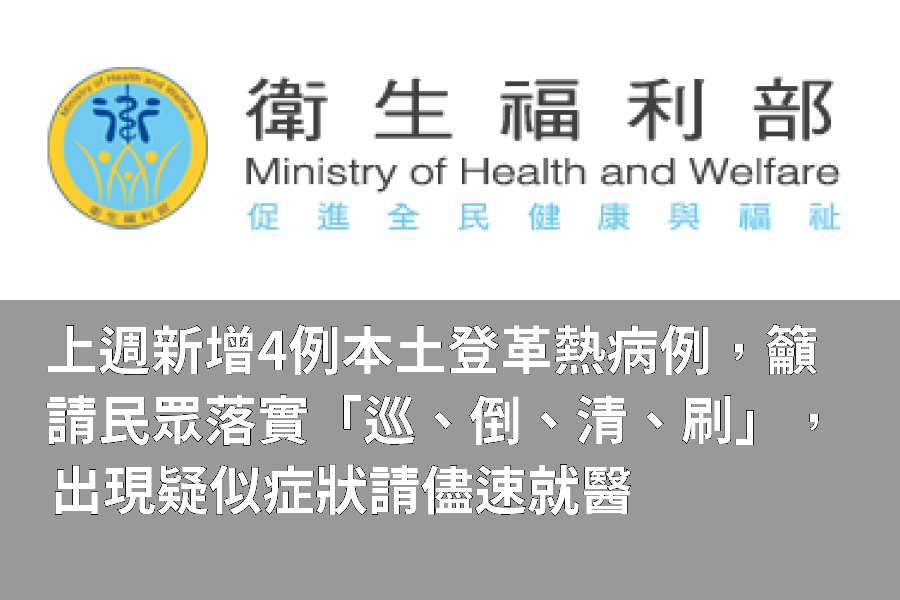 衛生福利上週新增4例本土登革熱病例,籲請民眾落實「巡、倒、清、刷」,出現疑似症狀請儘速就醫