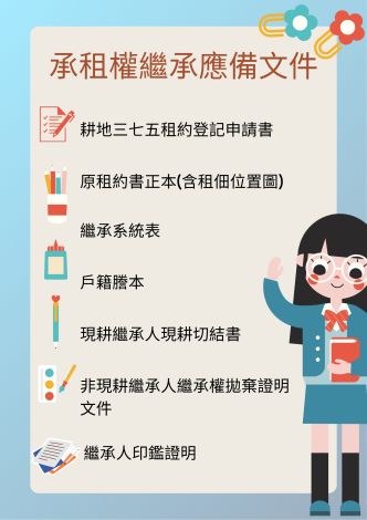 於轄區公所登記有案之私有耕地三七五租約,若承租人死亡應辦理租約變更登記,由現耕繼承人檢具繼承系統表、繼承人現耕切結書、非現耕繼承人繼承權拋棄證明文件、繼承人印鑑證明、承租人死亡時之戶籍謄本及繼承人現戶戶籍謄本各1份,會同出租人或單獨向公所申辦耕地三七五租約變更登記。