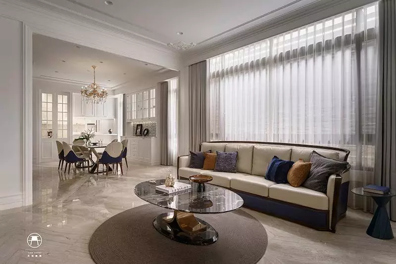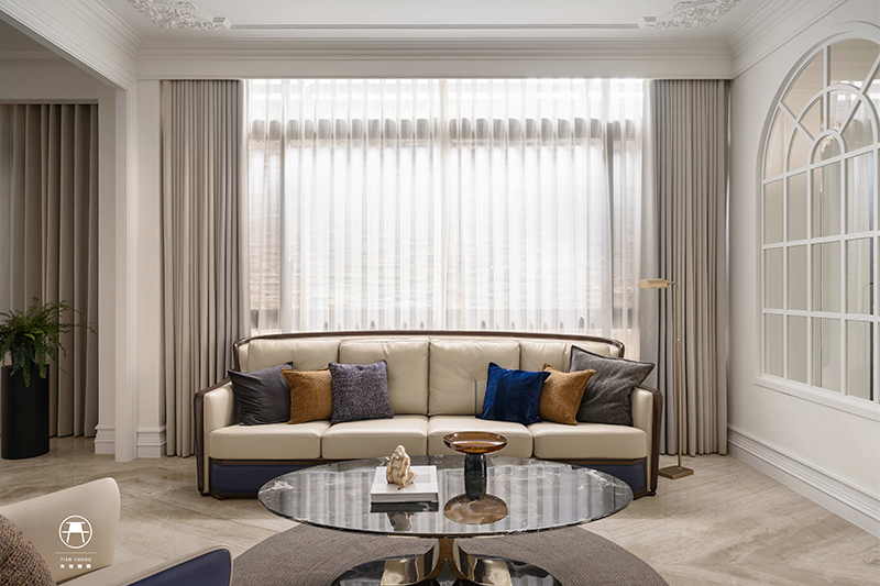 整體空間以奶油白作為基底,延續玄關的古典語彙,並引入大面積開窗,使自然光灑落於石材地坪與立面線板。輕盈的紗簾柔化光線,厚實布簾則賦予私密感,讓居住者能依情境自由轉換氛圍。白日的明亮與夜晚的靜謐,使客廳呈現出雙重層次。