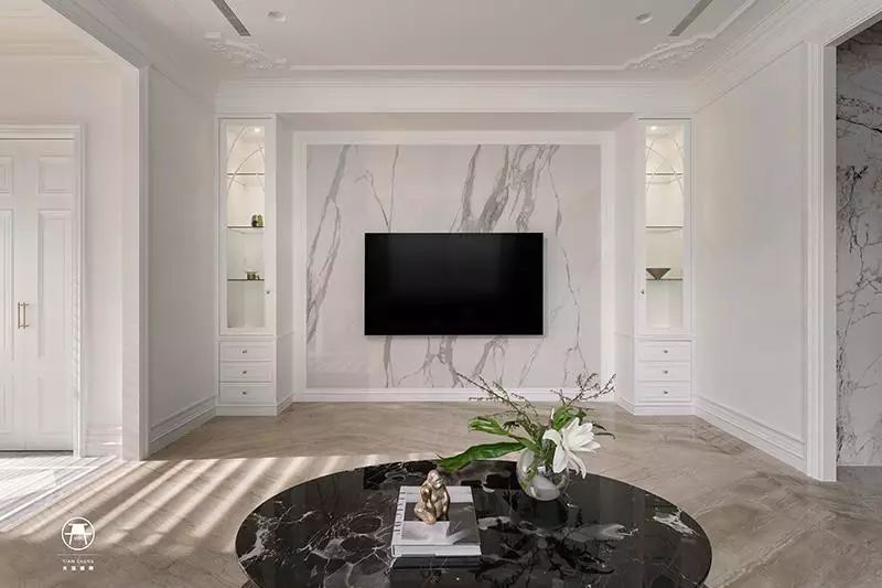 電視主牆選用大面積大理石紋理,線條延伸至天花與櫃體,形成完整的立面構圖。兩側展示櫃結合玻璃與間接燈光,讓藝術擺件與收藏品成為空間的一部分。這樣的設計,不僅增添空間的細膩感,也讓居住者在日常生活中,享有宛如精品宅邸般的氛圍。