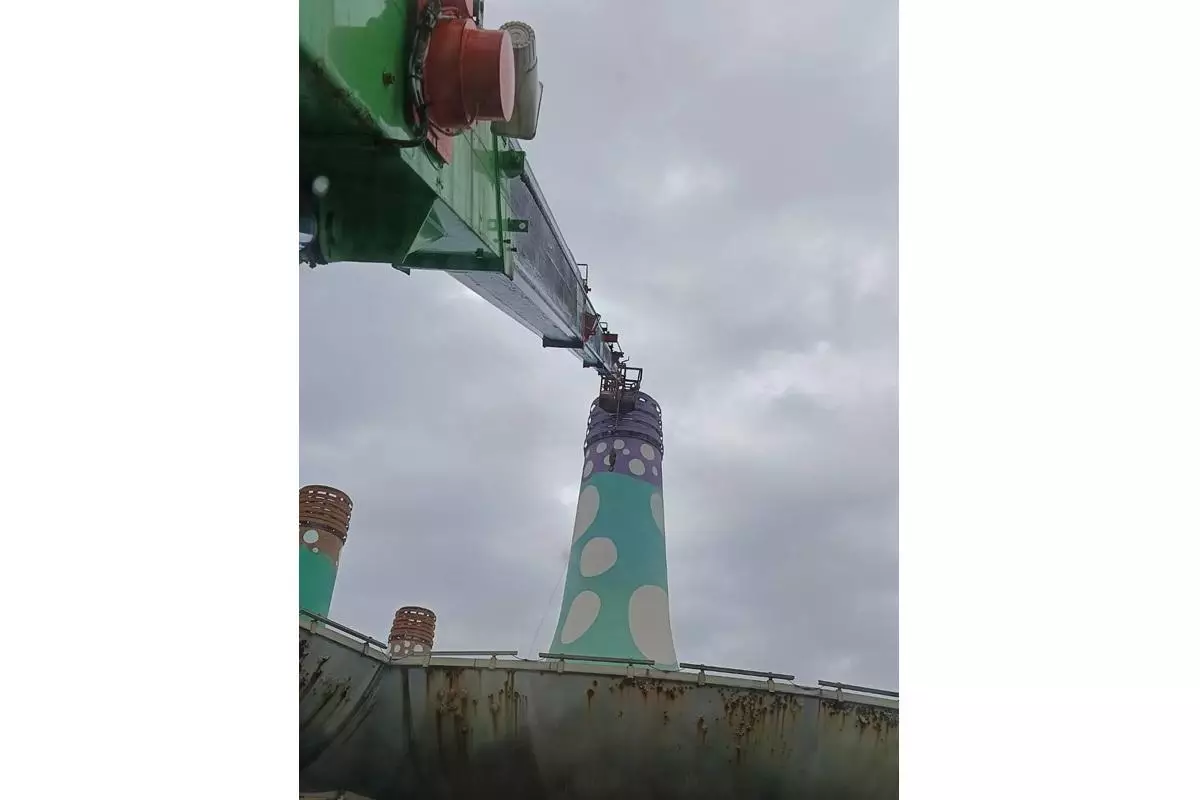 金溢吊車派出專業的小螃蟹吊車進場,憑藉靈活的機動性,順利進入狹窄巷道。操作人員仔細評估吊掛角度與安全性,僅花費短短數小時,便將舊主機移出、新主機吊掛到位。