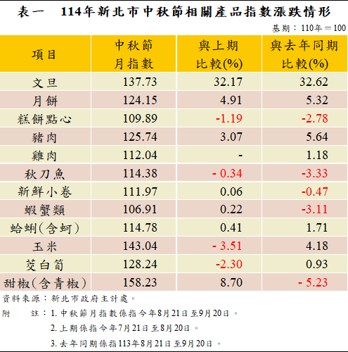 月圓人團圓的中秋佳節,賞月與烤肉乃應景的節慶活動,故市民關切相關食材的價格變動情形。近期新北市境內各應景食材物價指數之變動情形分述如下: