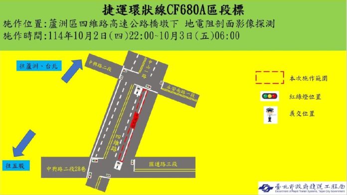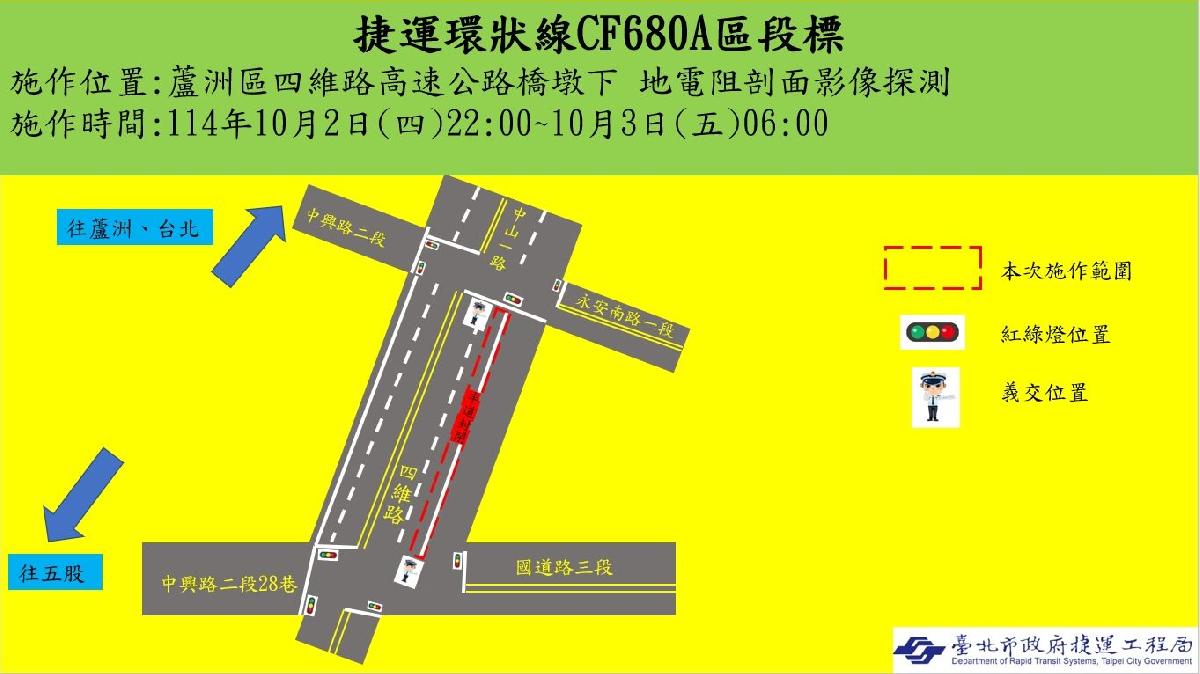 環狀線北環段CF680A標於114年10月2日(四)夜間22時至翌日6時,在新北市五股區四維路進行地電阻探測施工,施工範圍自五股區四維路與國道三號段路口至蘆洲區永安南路一段路口,封閉往北方向一個車道(如附圖),遇雨則順延隔日施工。