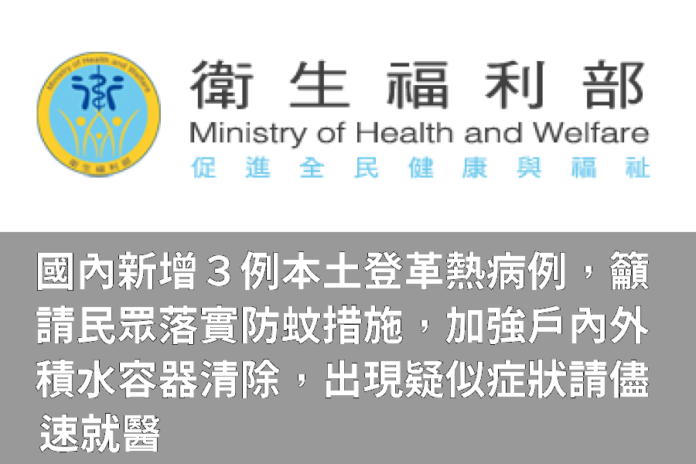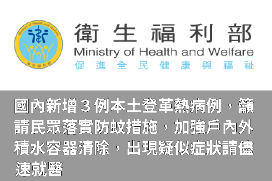 衛生福利國內新增3例本土登革熱病例,籲請民眾落實防蚊措施,加強戶內外積水容器清除,出現疑似症狀請儘速就醫