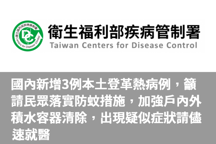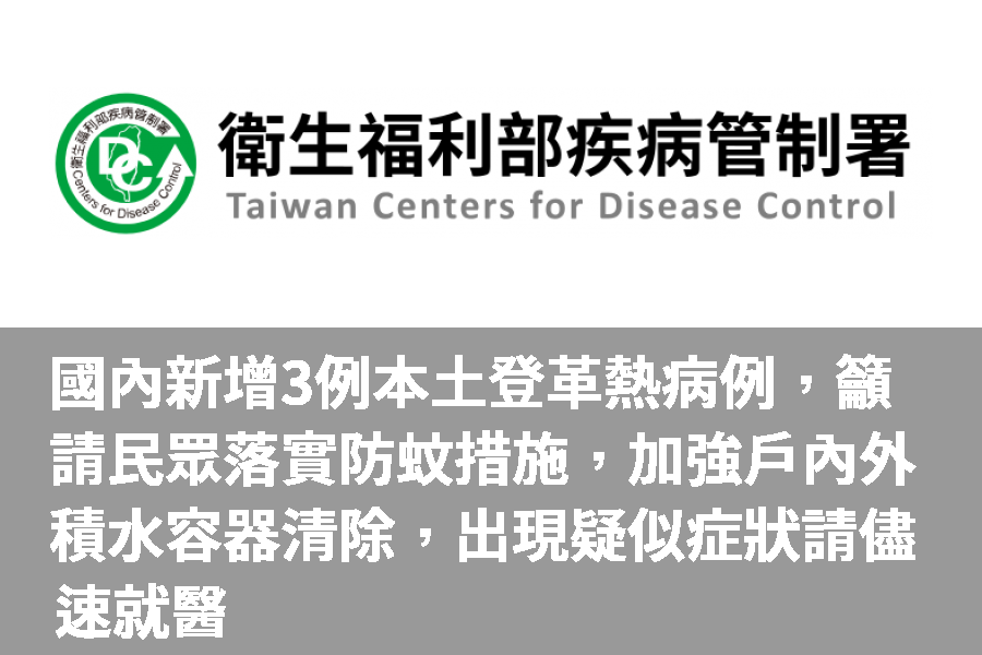 疾病管制署(下稱疾管署)今(2)日公布新增3例本土登革熱確定病例,其中1例為居住臺北市士林區80多歲男性,9月26日出現發燒及倦怠等症狀,並於次日就醫,9月30日因症狀未緩解至急診就醫並收治住院,10月1日檢驗陽性確診登革熱,個案於潛伏期無國外旅遊史及桃園市本土登革熱疫情發生地區活動史,主要活動地點為居住地及鄰近公園,研判為本土病例,感染源仍待釐清,目前住院治療中,同住者目前皆無症狀;另2例為桃園市龜山區社區群聚案,為同一家戶,分別為60多歲男性及70多歲女性,前者與群聚指標個案於潛伏期曾有共同活動史,經衛生單位擴大採檢主動發現。衛生單位持續針對前揭個案居住地及及周圍環境進行病媒蚊密度調查及孳生源清除等防治工作,加強附近居民健康監測,同時請當地醫療院所提高通報警覺。