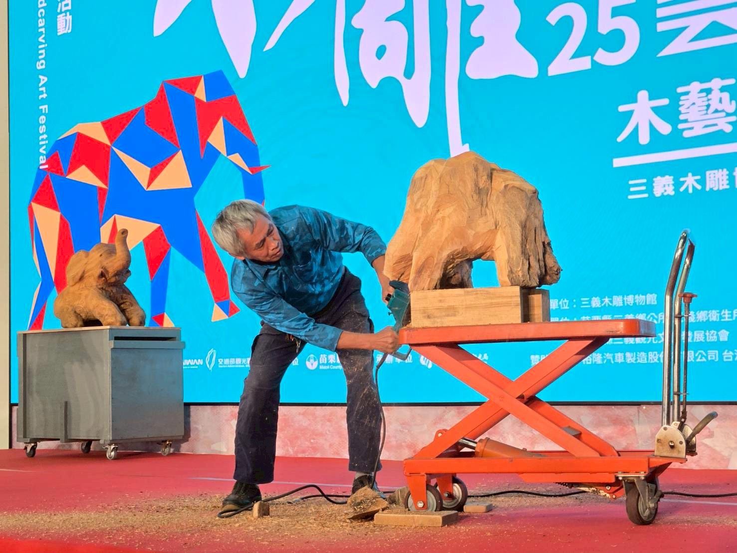 今(2)日記者會現場特別邀請了木雕大師簡明光老師現場展現木雕技藝,現場創作「大象」,同時邀請三義木雕協會、水美商圈代表、木雕、文創業者以及三義在地社區發展協會皆參與記者會,展現各界為推動三義觀光旅遊共同努力的決心。