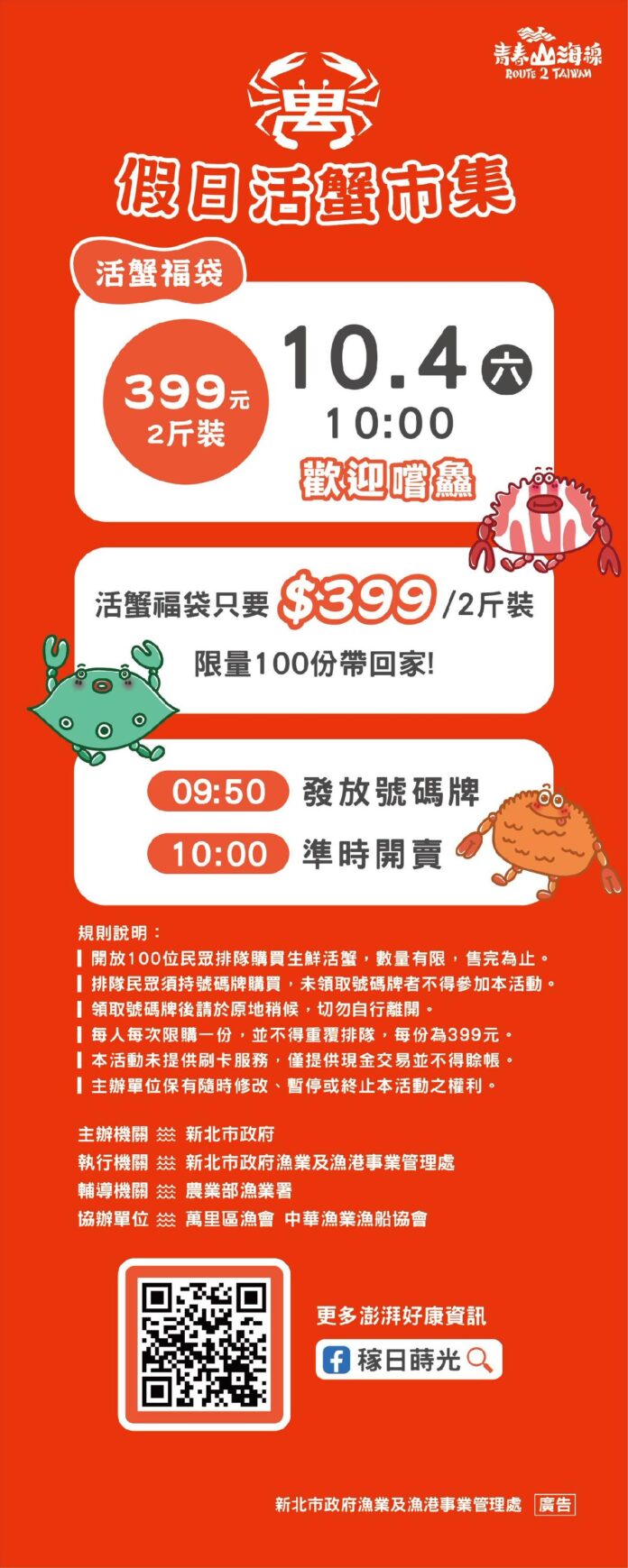 又到了萬里蟹產季,饕客們熱烈敲碗的野柳假日活蟹市集即將在10月4日開市啦!現場不僅有「現買現蒸」的鮮甜萬里蟹,開市當天更推出限量100份「超值活蟹福袋」,每份2斤只要399元,回饋長期支持萬里蟹的民眾。此外,還有「捕蟹趣」及「漁村漫漫遊」活動,讓民眾到產地有吃又有玩,新北市漁業處誠摯邀請大家在中秋連假相揪親朋好友來野柳漁港,享受現場最鮮甜的萬里蟹美味,體驗漁港的獨特魅力,歡度佳節!