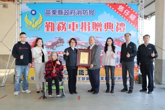 高鐵工業股份有限公司7日捐贈苗栗縣政府消防局幫浦消防車以及災情勘查車,苗栗縣副縣長鄧桂菊、消防局長匡夢麟代表受贈,並與縣長鍾東錦夫人陳美琦一同頒贈感謝狀,感謝高鐵工業總經理王秋桂的善心義舉,未來定能提高救災及勘災效率。