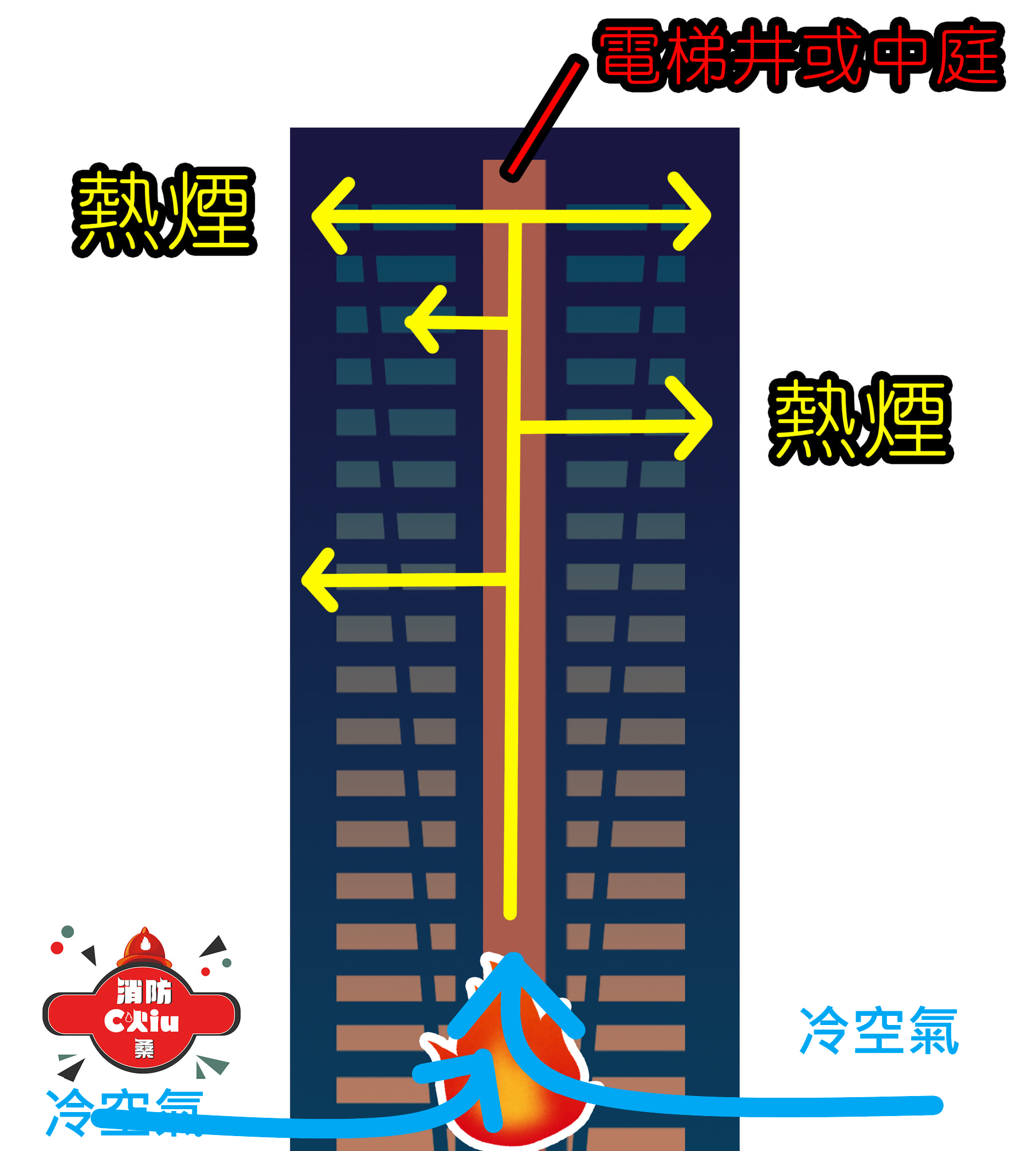 電梯在火災中可能隨時會斷電,且電梯井形同一個空氣流通的垂直通道,垂直空間中由於熱空氣密度較低會向上流動,而冷空氣從下方補充,使空氣加速對流,從而加劇火勢蔓延並使火勢迅速擴大,我們將其稱之為煙囪效應。因此搭乘電梯是最危險的選擇!若曾有民眾表示他搭乘電梯從火場中逃生純屬幸運,請大家發生火警時應乖乖走樓梯下樓,不要再搭乘電梯!