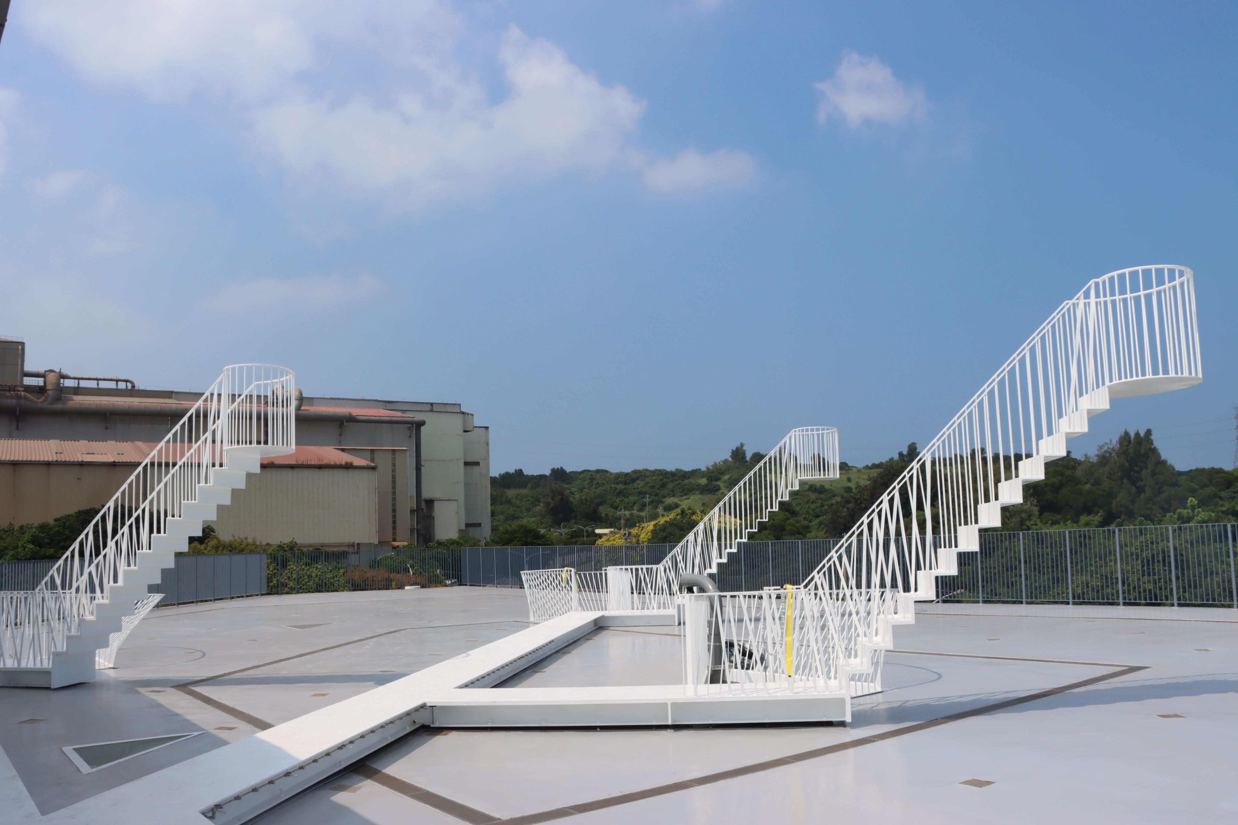 今年第2屆「煉計畫」以「如其在上,如其在下」為主題,邀請建築師郭旭原、黃惠美挑戰大尺度結構與美學表現,在離地10米高的平台上,打開3處天窗,置入3組構造物,每組構造都有往上及往下的梯階,每一踏階鋼板的厚薄與扶手的尺寸皆因結構需求而建造。