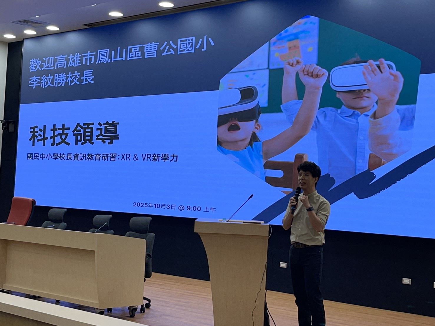 本次研習主題為「科技領導XR & VR新學力」,特別邀請在資訊教育領域長期深耕的李紋勝校長擔任講師。活動內容除專題演講外,亦分享其於旗山國小任職期間,如何運用 VR、XR及教育元宇宙進行跨校與跨國沉浸式教學,並與日本美國學校進行國際共學的案例與成果,展現培養學生跨域整合能力與未來素養的實踐經驗。同時,也說明科技領導在教學現場的重要角色,協助校長掌握教育數位化的最新趨勢,作為規劃學校發展藍圖的重要方向。