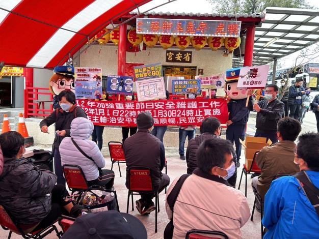 「虎辭勝歲、兔躍新程」,國內一年一度的宗教盛事「苗栗縣通霄鎮白沙屯拱天宮媽祖」前往雲林縣北港徒步進香活動,循古慣例、拱天宮廟方訂112年1月6日(農曆12月15日)下午1點由拱天宮主任委員洪文華主持擲筊大典,並由值年爐主擲筊向白沙屯天上聖母詢問進香期程,通霄分局『犯罪預防宣導團』受邀前往活動現場辦理「112年度加強重要節日安全維護工作-治安平穩、交通順暢、民眾安心」宣導。