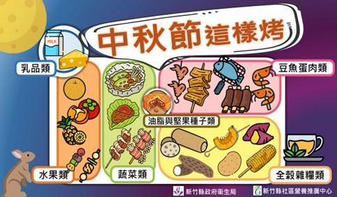 烤肉、吃月餅是很多人歡慶中秋節的方式,新竹縣政府衛生局提供秋節應景的「六大類我的餐盤」結合在地食材的資訊,希望民眾秉持均衡飲食7原則—豆魚蛋肉聰明選、不忘蔬菜小幫手、全榖雜糧營養多、每天足夠乳品類、香烤水果賞月光、點心滿足堅果類、飲品相伴享中秋,健康歡度八月半(中秋節客語)。