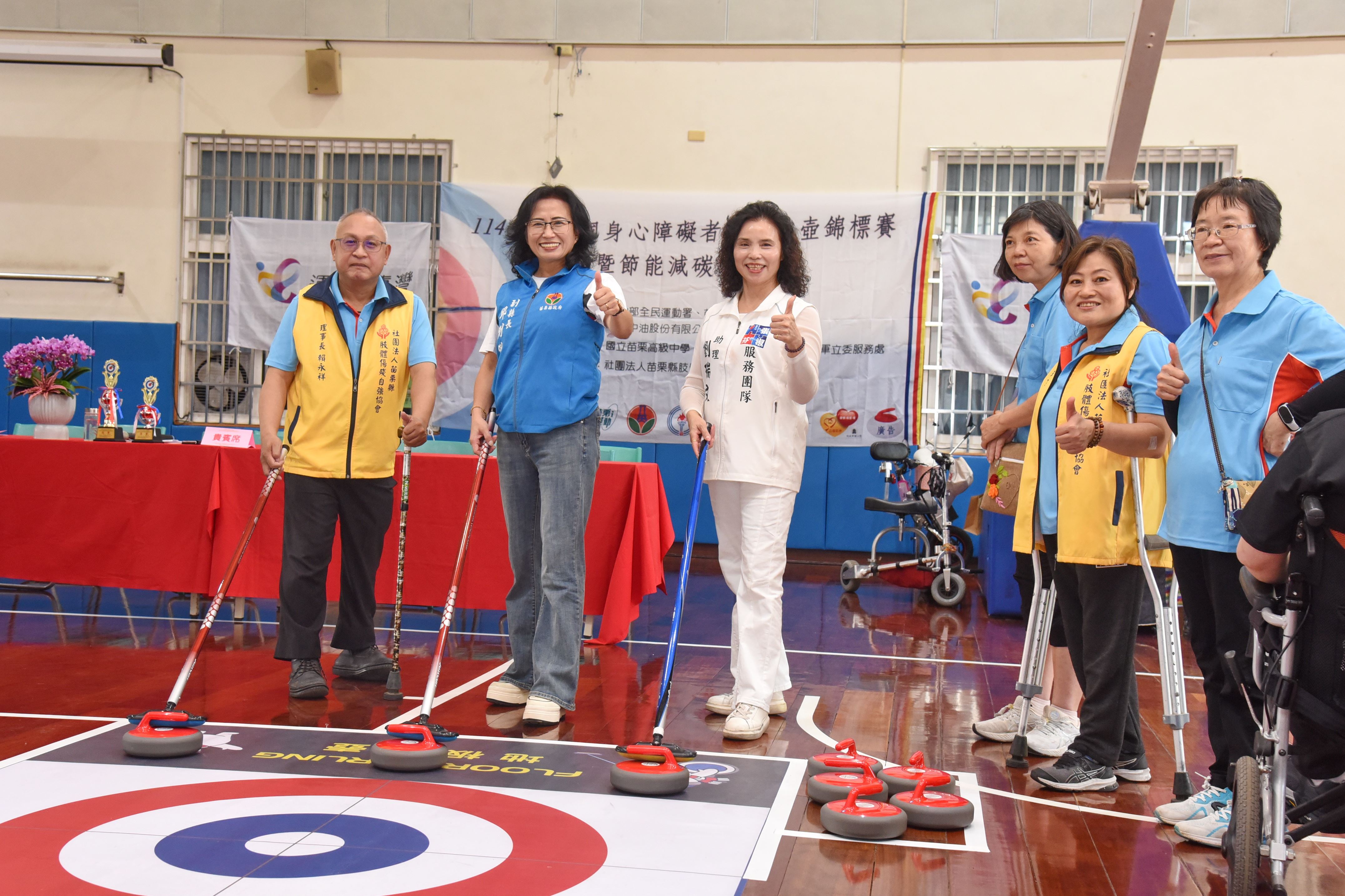 社團法人苗栗縣肢體傷殘自強協會主辦的114年度全國身心障礙者地板冰壺錦標賽暨節能減碳宣導,5日上午在國立苗栗高中活動中心登場,有來自5縣市15支隊伍逾百位帕拉選手參賽,也吸引不少家屬和民眾體驗趣味競賽;副縣長邱俐俐偕多位來賓到場主持「開壺」儀式,為參賽選手加油打氣,她數度豎起雙拇指肯定他們突破有形障礙展現無窮戰力的精神。