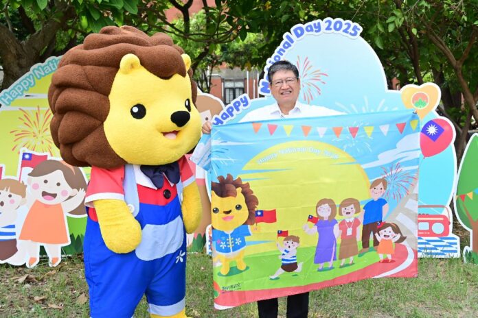 另外,府前廣場兩側草皮也安排2款拍照背板,為可愛的皮皮獅歡慶國慶背板,歡迎民眾自由拍攝,留下美好的回憶。