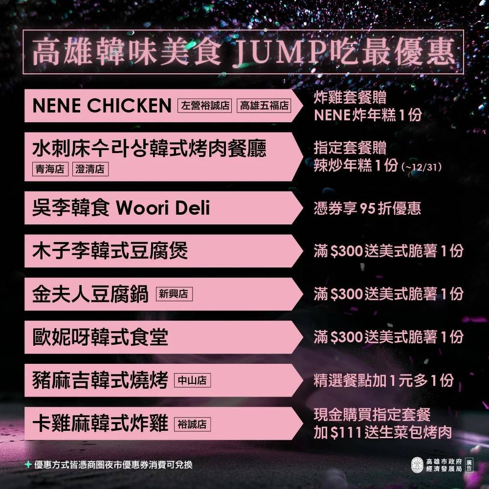 經發局補充,樂迷憑指定演唱會門票即可至6處捷運站(左營、美麗島、巨蛋、高雄車站、三多商圈、鹽埕埔及高雄車站)兌換50元商圈夜市優惠券,左營站發券櫃檯更將設置演唱會打卡牆,歡迎粉絲一下高鐵就來打卡!還能加碼享有特色餐廳各式優惠,以及夢時代、SKM PARK、漢神巨蛋、新光三越、高雄大遠百、SOGO、義大遊樂世界等百貨業者推出的折價券、體驗券與專櫃折扣,也歡迎各位粉絲踴躍報名「K-POP隨播即跳舞蹈大賽」舞蹈大賽(報名網址https://reurl.cc/0WN82Y)。請隨時關注經發局FB粉絲團、IG及商圈夜市優惠券官網(www.khafterparty.tw),和各大百貨官網、DM,一起倒數BLACKPINK IN YOUR AREA。