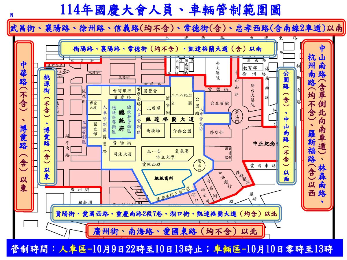 臺北市政府警察局為配合10月10日國慶日各項慶祝活動需要,將於會場周邊區域及道路實施交通管制,相關管制時間、區域及措施如下:
