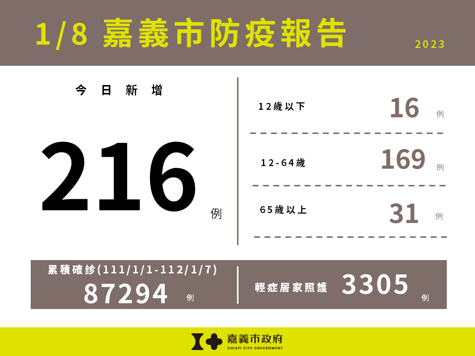 中央流行疫情指揮中心今(1/8)日公布嘉義市新增216例確診個案,包含12歲以下16例,12-64歲169例,65歲以上31例。嘉義市目前輕症居家照護人數3,305人。111/1/1截至112/1/7嘉義市累計確診嚴重特殊傳染性肺炎本土病例數為87,294人。 衛生局提醒,請大家儘速接種疫苗,並持續落實勤洗手、咳嗽禮節及佩戴口罩等防疫措施,避免出入人多擁擠的場所及高感染傳播風險場域,如出現疑似症狀,儘速快篩就醫和遵從醫囑及早服藥,降低重症及死亡風險;並請養成規律運動、均衡飲食、充足睡眠、壓力調適、不吸菸等健康習慣,提升免疫力,守護自己與家人的健康。
