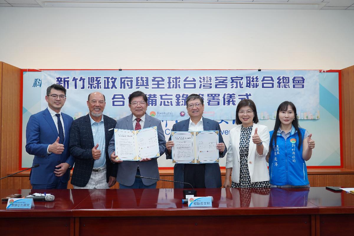 新竹縣長楊文科於10月7日上午在縣政府簡報室,與全球台灣客家聯合總會長黎萬棠共同簽署合作備忘錄,來自雪梨、非洲、印尼及日本等地的客家鄉親也到場,見證客家文化躍上國際的重要時刻。楊縣長期許雙方合作,讓客家精神發光發熱。他並頒發縣政顧問聘書予黎萬棠總會長,希望借助黎總會長的影響力,讓世界各地客家人對新竹縣的發展、傳承客家文化的努力,有更深的認識。