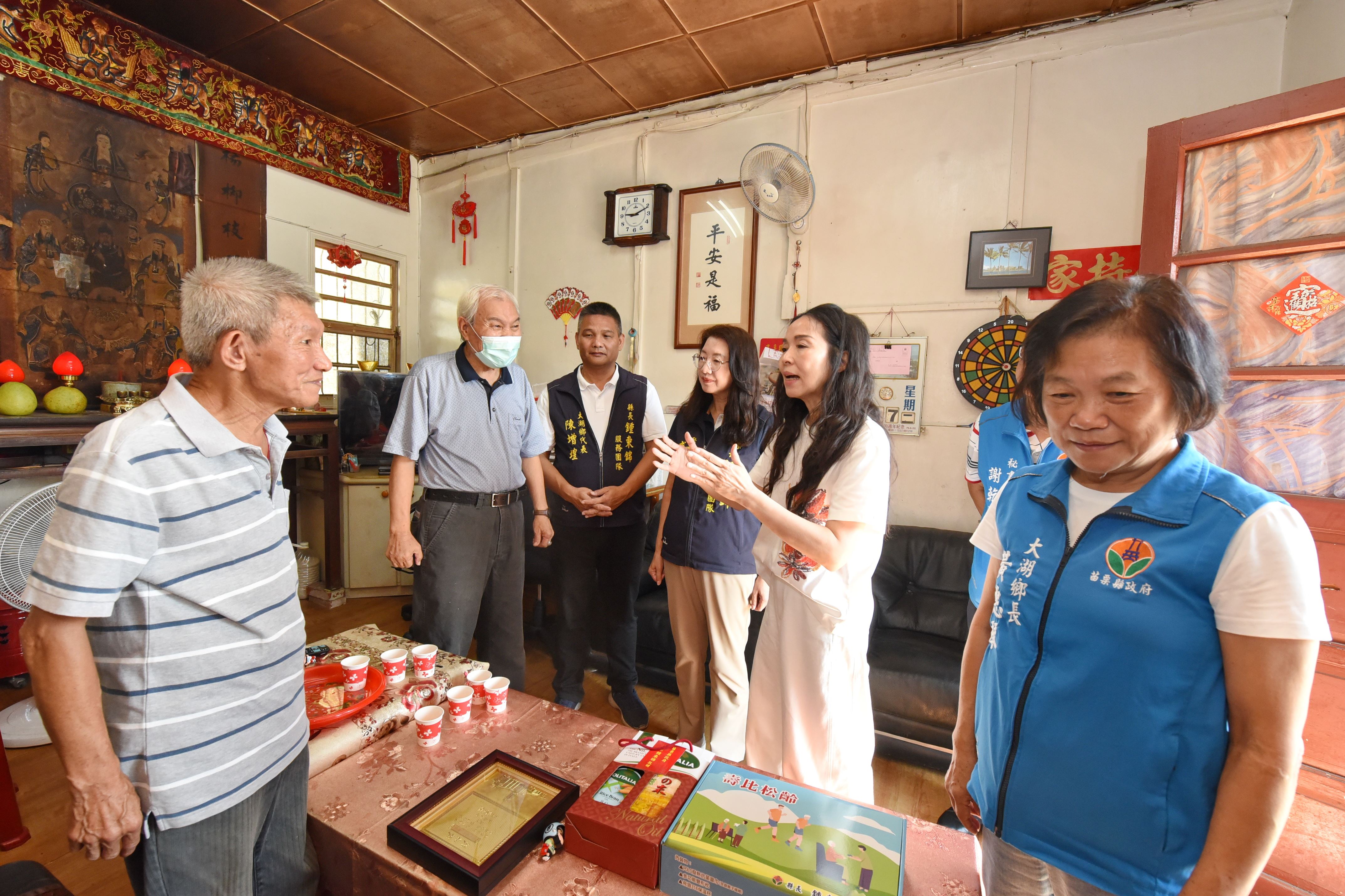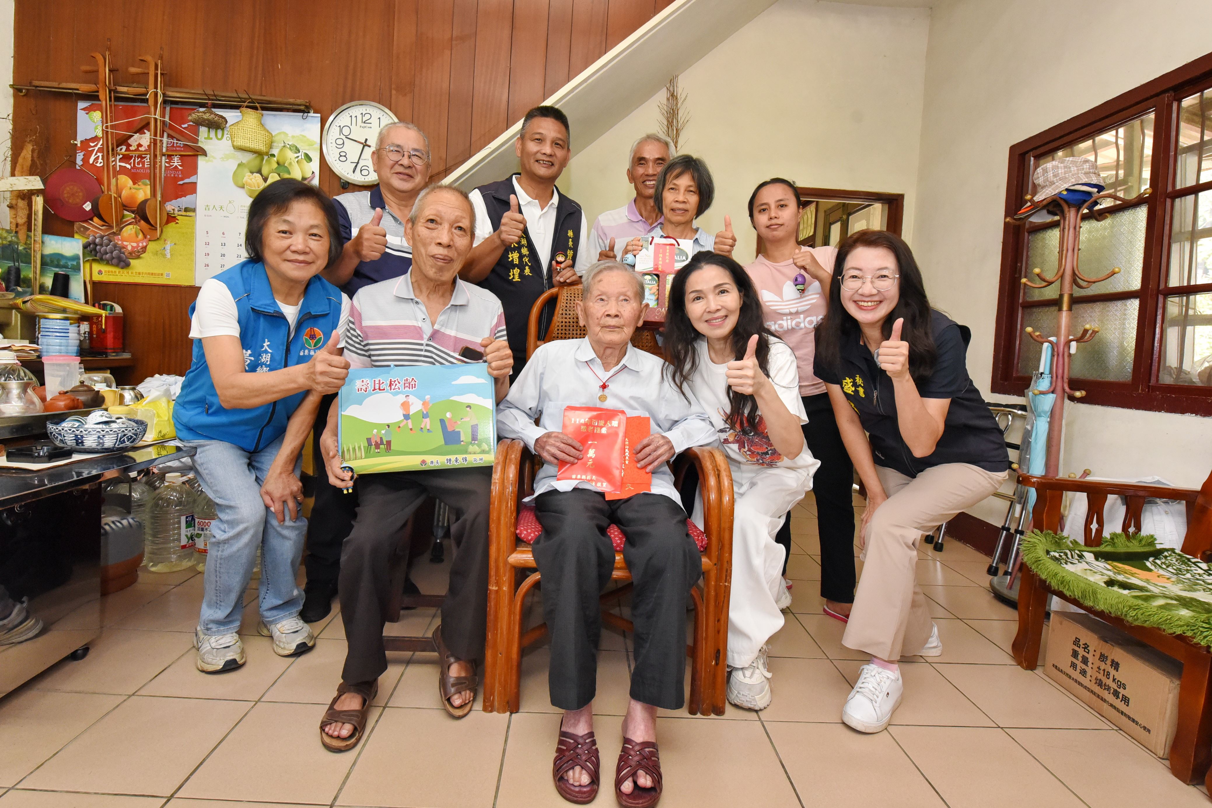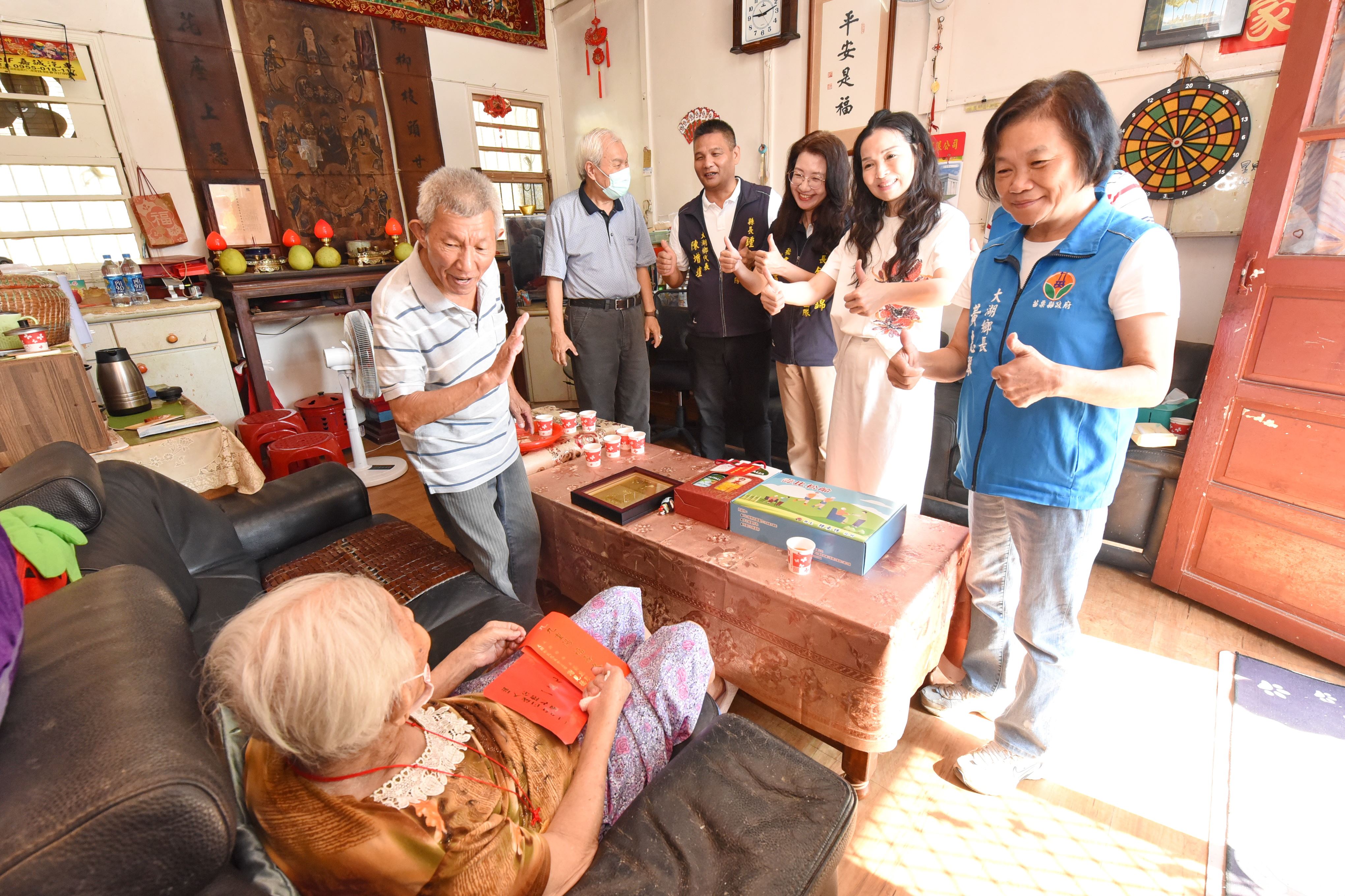 其中,彭涂靜妹老太太目前與次子彭錦機同住,長子彭錦威也回老家團聚分享喜悅;老太太原本身體狀況不錯,能夠自己行動,因2年半前意外跌倒住院1個多月後,健康狀況略受影響。縣長夫陳美琦看到居家環境整齊乾淨,老人家也獲得細心陪伴和照顧,讚許家人孝行可嘉。