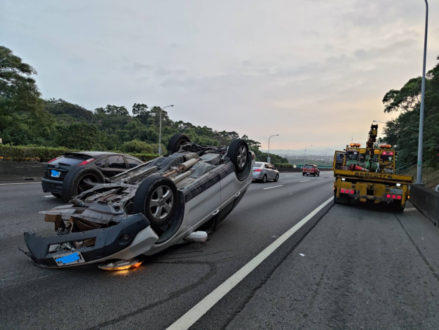 救護車先行抵達現場後,發現一輛自小客車後方翻覆,所幸駕駛已自行脫困。經救護人員初步詢問,駕駛表示因前一日晚間休息不足,精神不濟導致行車不專心,進而發生事故。所幸駕駛並無明顯外傷及不適,婉拒送醫服務,救護人員完成回報後返隊。
