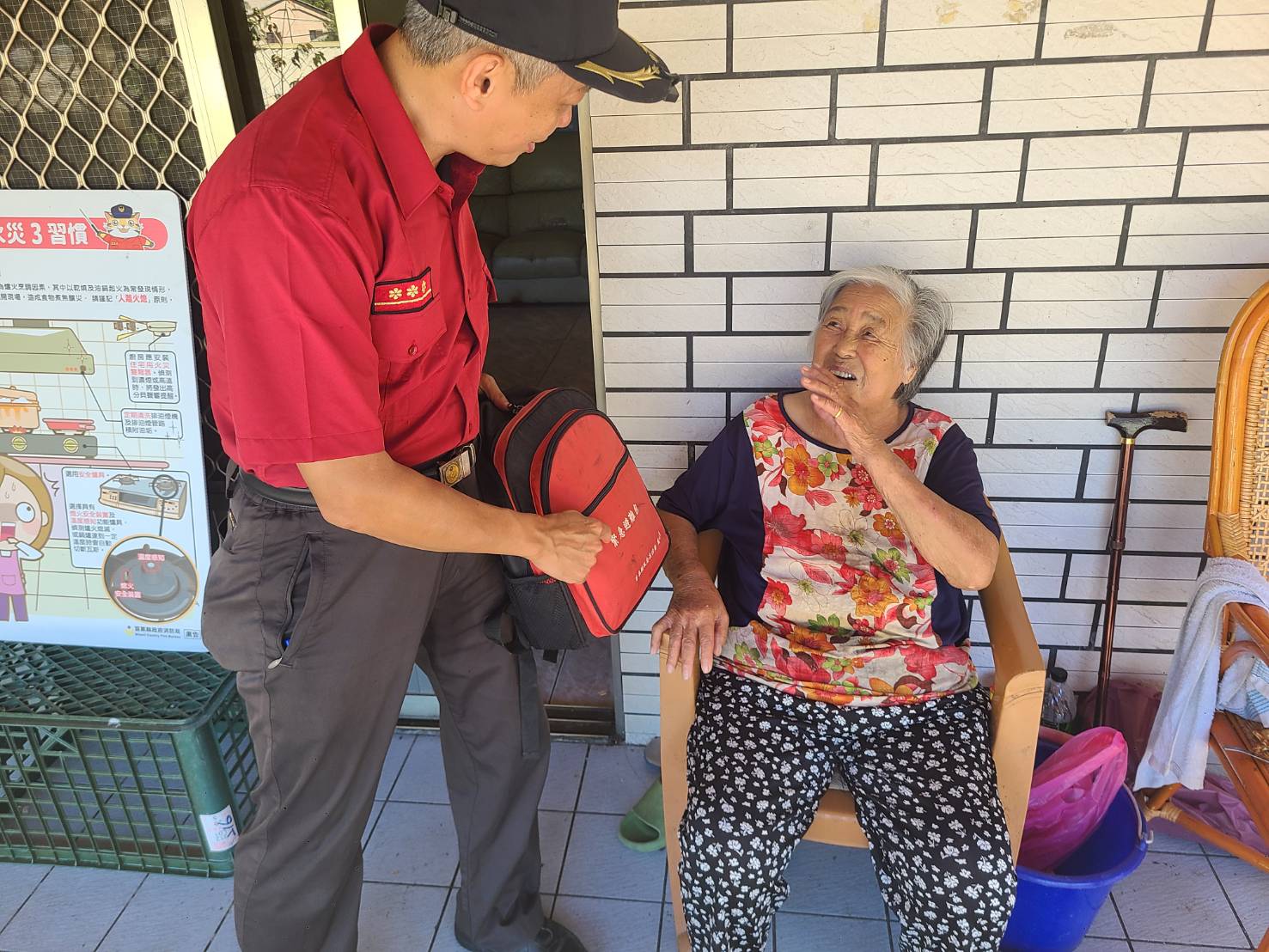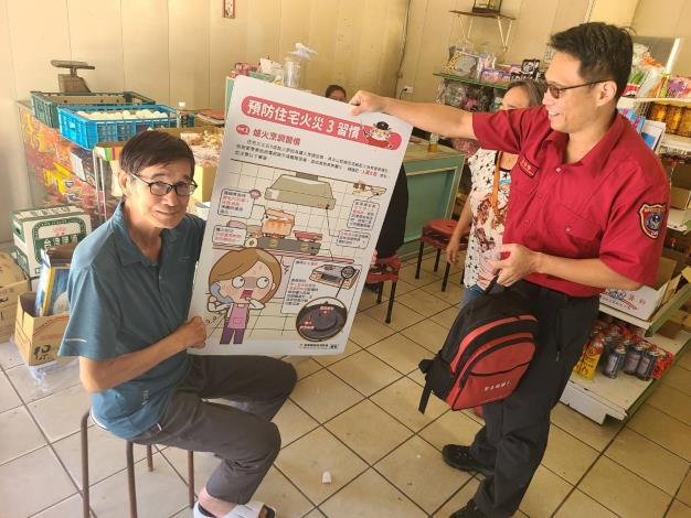 宣導重點包括正確安裝住宅用火災警報器的重要性,若安裝位置不當,可能導致偵測延遲或無法在火災初期發出警示;提醒村民於走道或臥室等適當位置設置,並定期測試電池功能。另也針對廚房用火安全及電器延長線使用方式進行說明,強調避免過度負載與長時間通電,並提醒熟記火場逃生原則及準備防災避難包,以提升家庭與社區的防災應變能力。