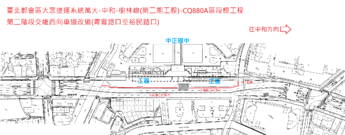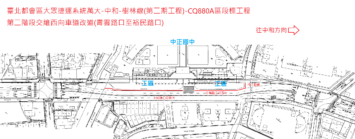 為配合捷運土城樹林線CQ880A(土城地下段)區段標LG10站北側連續壁施工,進行第二階段交維佈設,於114年10月9日(四)起將原土城區金城路2段(青雲路至裕民路間)道路中央施工圍籬移往金城路北側,往中和方向車道配合移往南側設置,施工圍籬移設後仍維持雙向各兩車道配置。本階段交維施作期程預計自114年10月9日起至115年7月9日止,施工期間請用路人遵循導引標誌及現場指揮人員指示,配合減速通行。