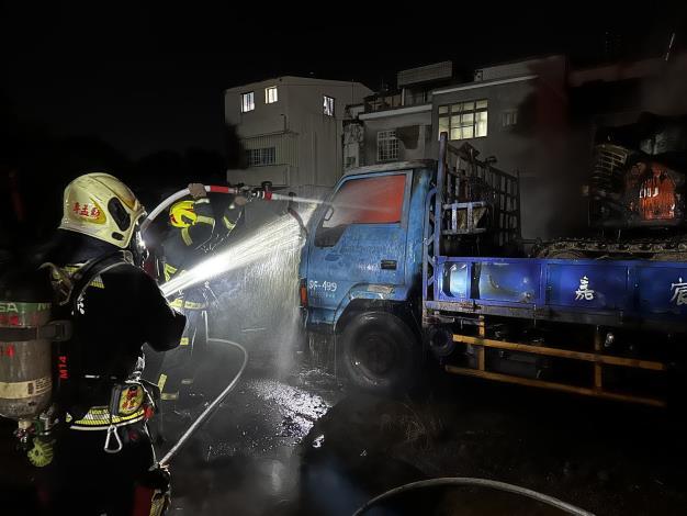 現場為一輛小貨車及一部怪手起火燃燒,消防人員抵達後迅速佈署兩條水線進行撲救,火勢很快受到控制。經熱顯像儀(TIC)確認現場無殘留熱源後,消防人員安全返隊,無人員傷亡。