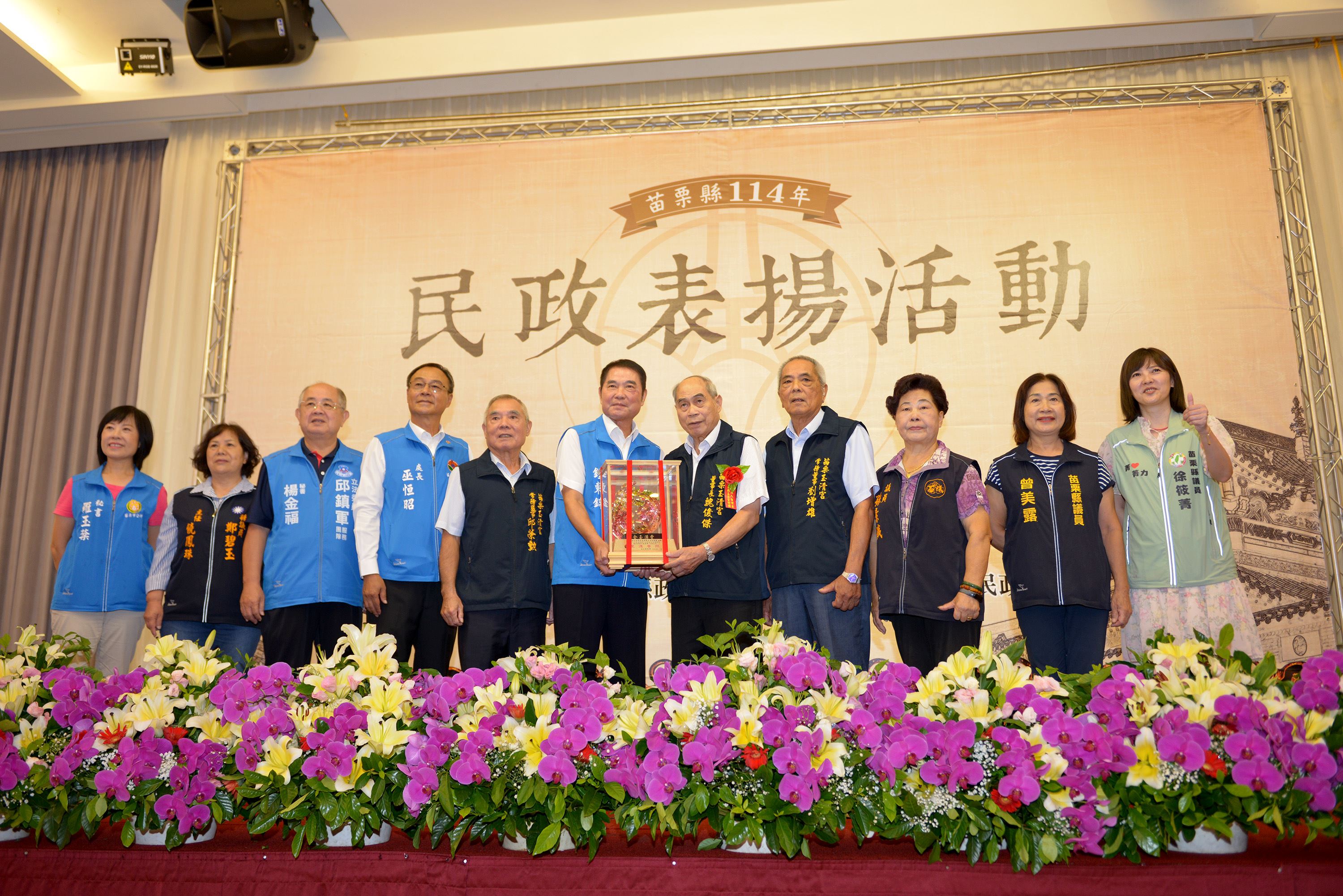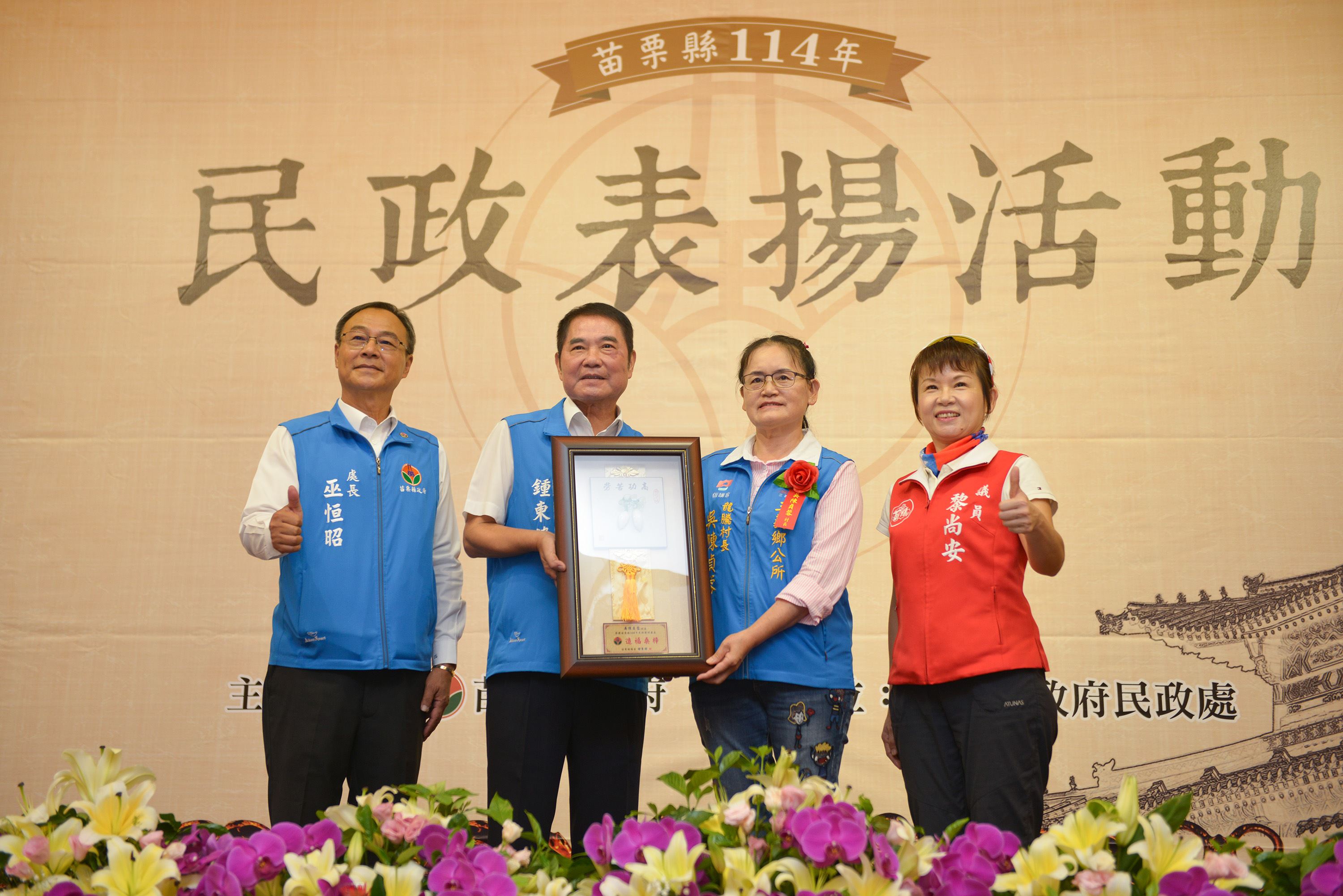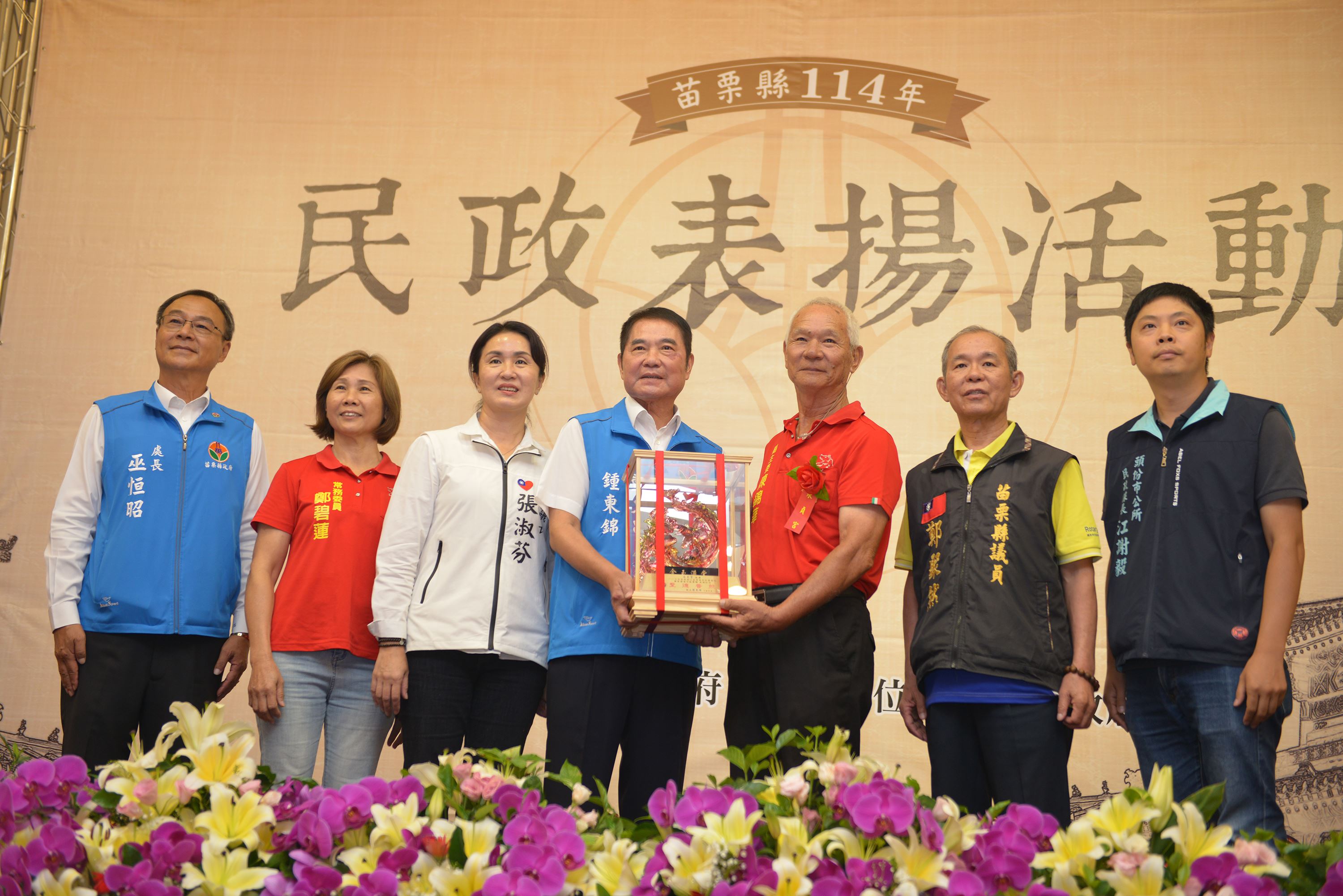 8日苗栗縣長鍾東錦以及各級民意代表、貴賓等逐一頒發匾額、獎牌、禮品,感謝受獎者和單位站在第一線為民服務的辛勞。鍾縣長表示,村里長是地方上的土地公,還有民政人員及戶政人員,是民眾與政府之間最重要的溝通橋樑,是縣政推動的基石。