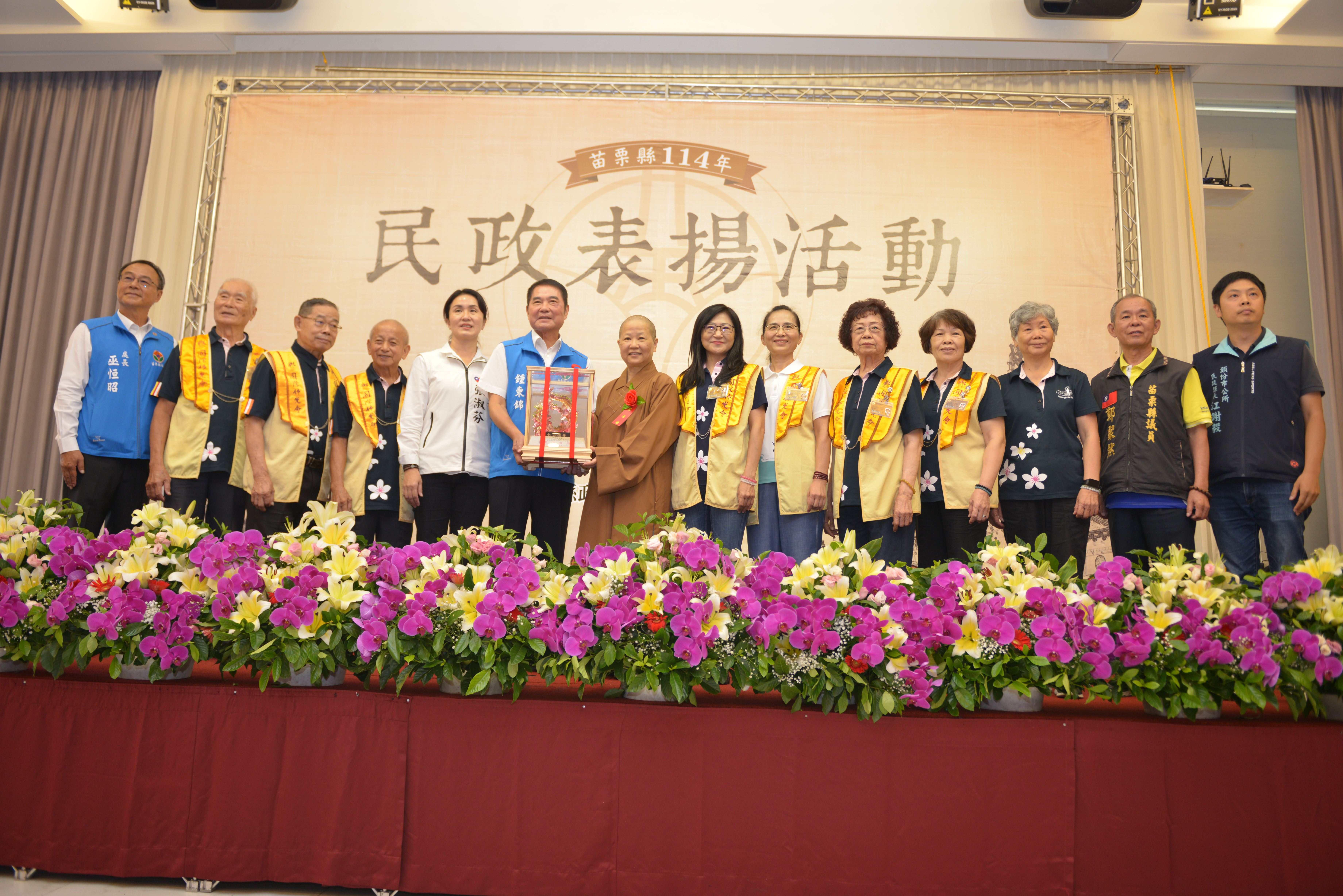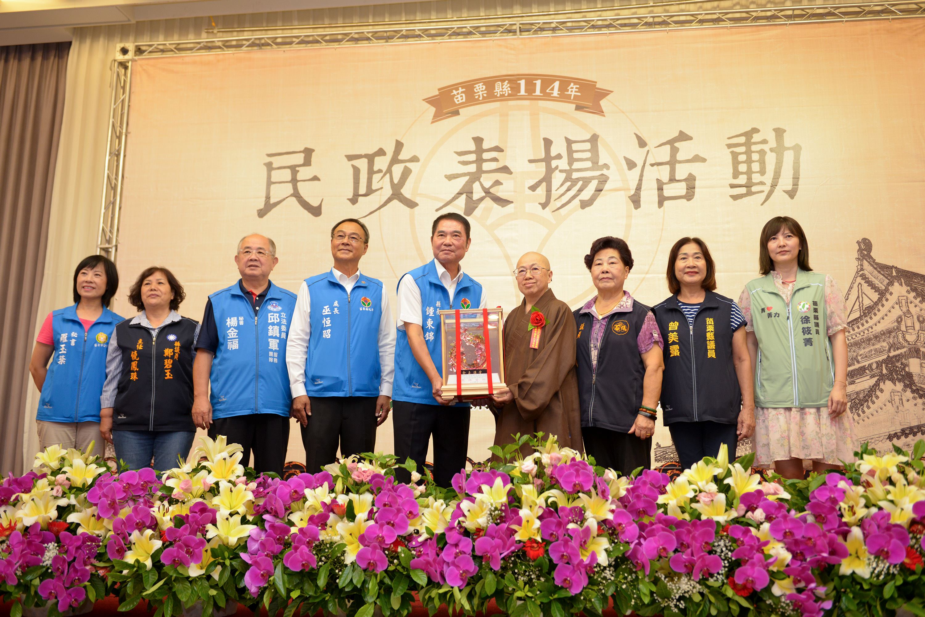 鍾縣長指出,宗教團體在地方上扮演著穩定社會、凝聚人心的重要角色,今年共22家榮獲「苗栗縣績優宗教團體」,其中佛光山大明寺、苗栗市福星山淨覺院、宏法社、苗栗縣月稱光明寺及後龍鎮萬善祠等5家宗教團體,更榮獲內政部「全國績優宗教團體」表揚殊榮。另外,今年配合節能減碳政策具有優良成效之寺廟共5家,分別為苗栗縣月稱光明寺、一貫道天泉宮、溫靈宮、廣思講堂及新蓮寺。