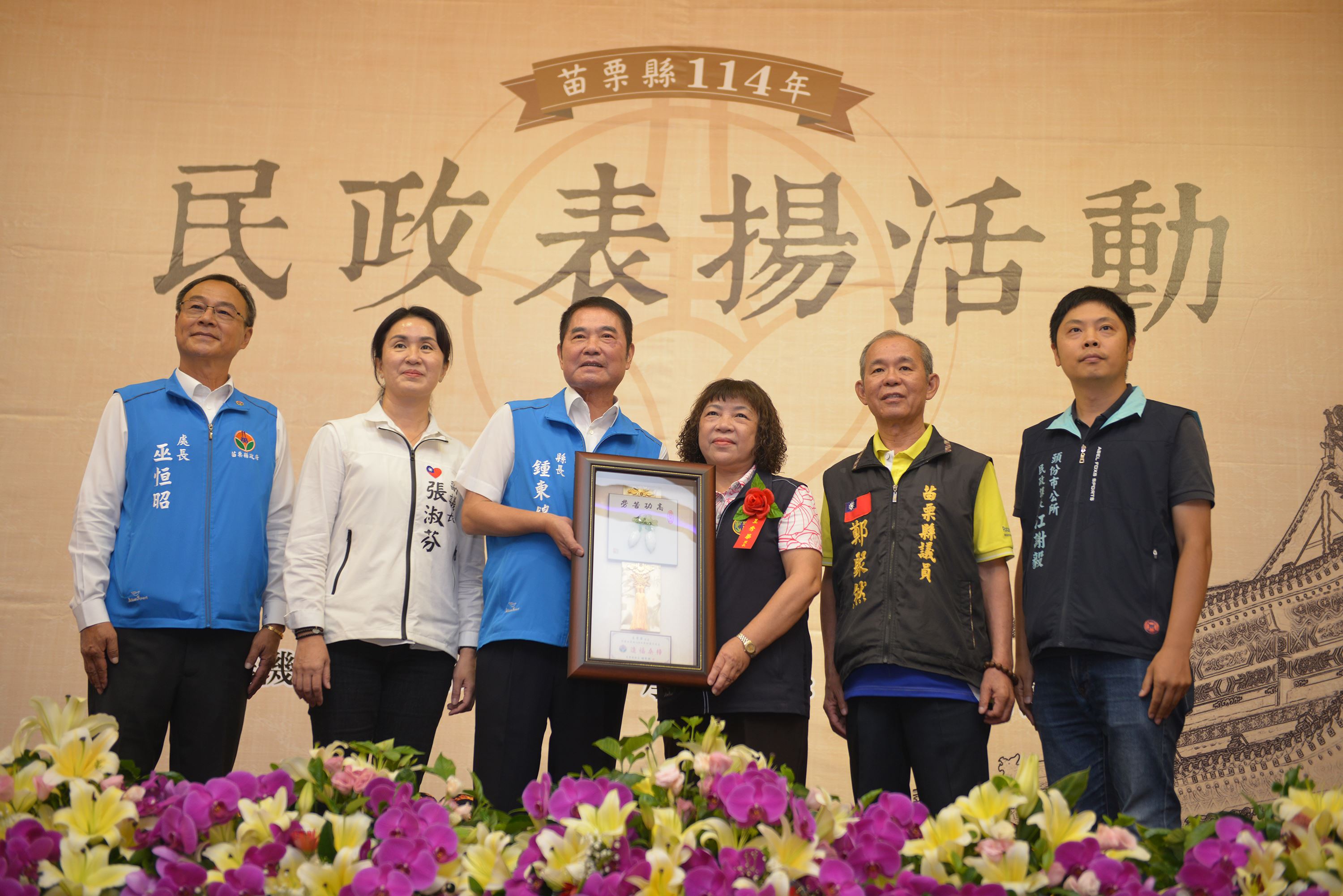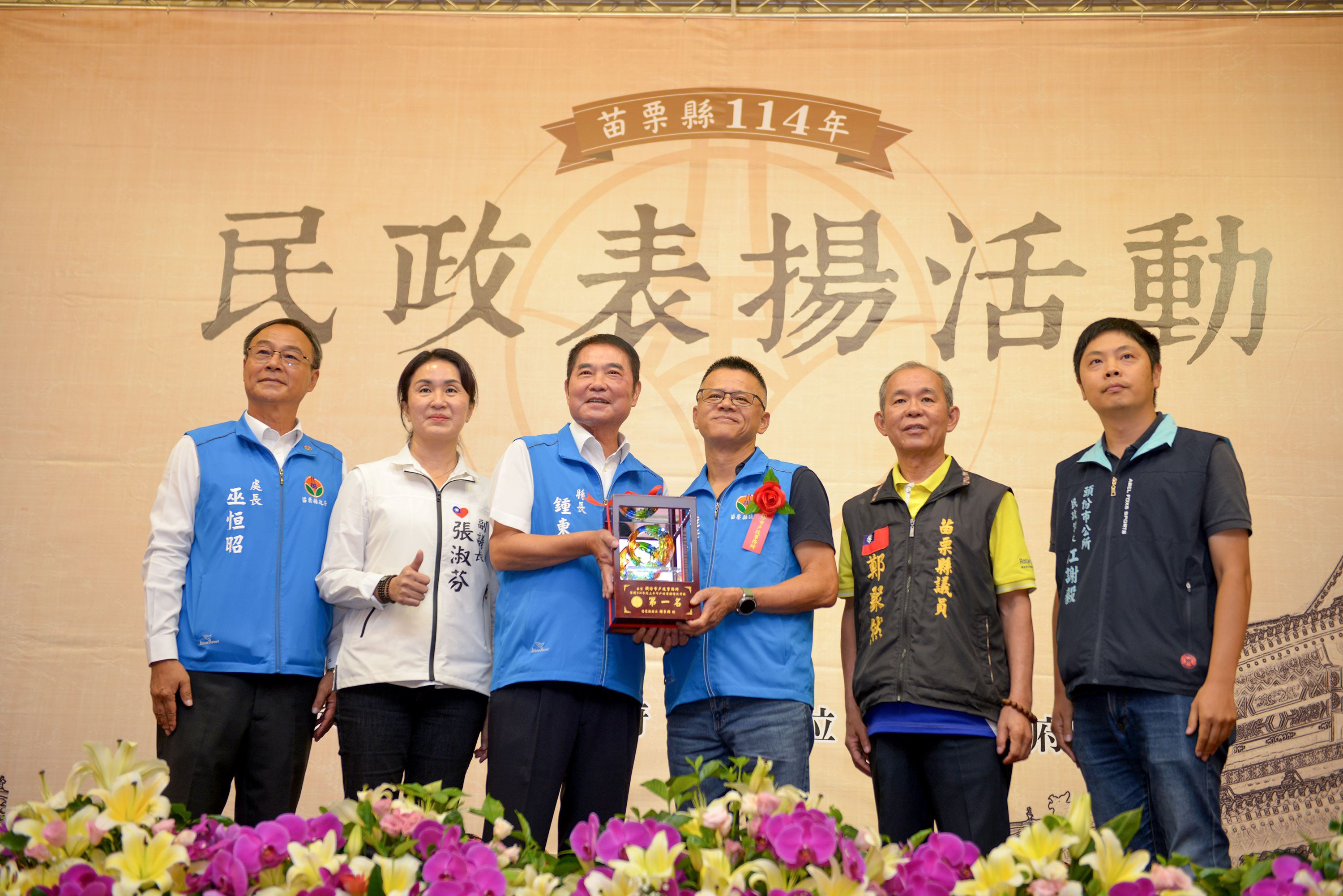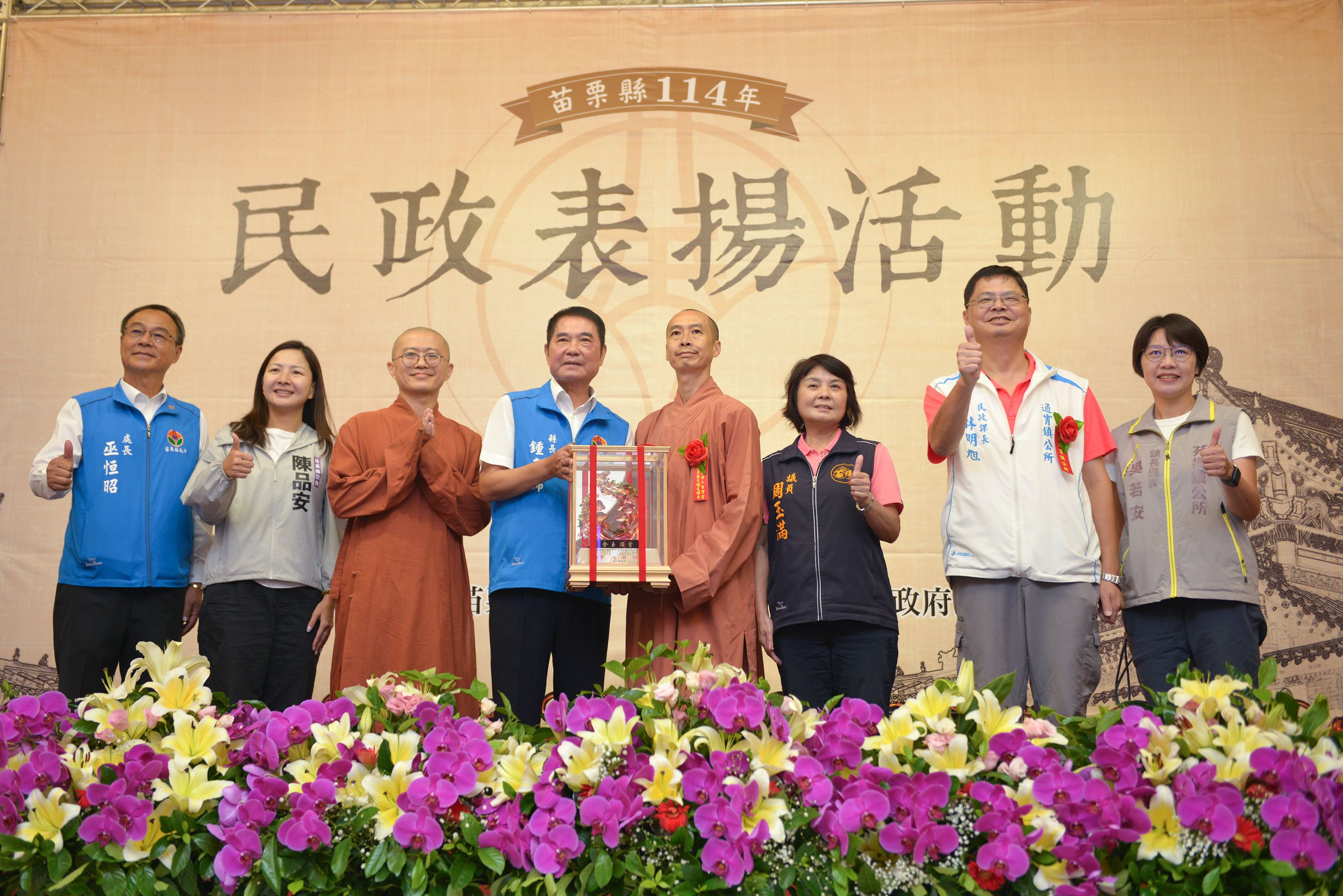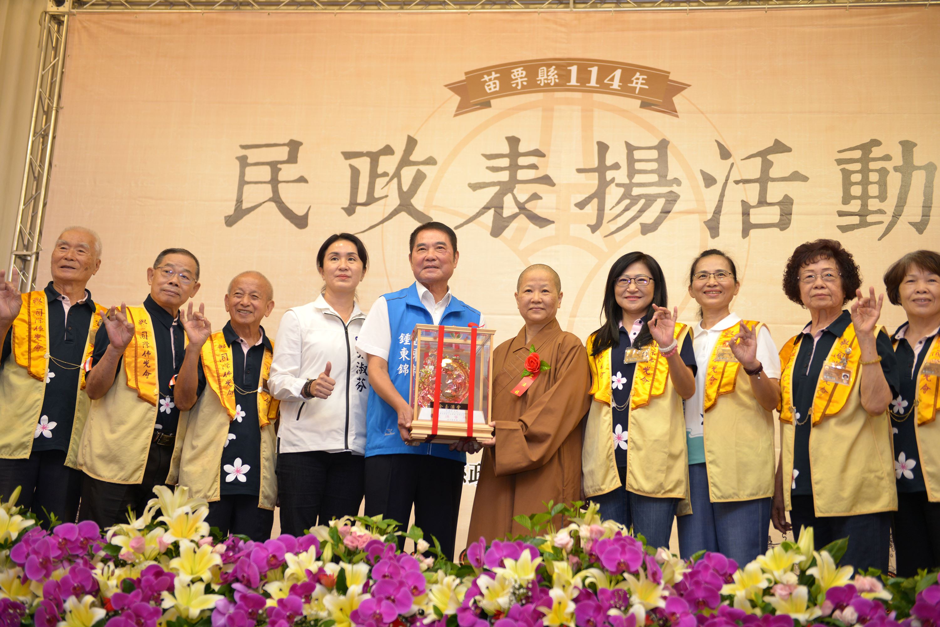 苗栗縣政府10月8日上午在苗栗市千璽會館辦理民政表揚大會,共有95個人員或單位接受表揚,包括績優宗教團體、宗教場所低碳認證、孝行楷模、績優村里長、績優民政及戶政人員,以及殯葬設施與經營業者評鑑優等、績優戶政機關、人員及志願服務工作者等。苗栗縣長鍾東錦感謝受獎人和單位,因為有他們的努力,使得縣內民政業務能有效推展,讓苗栗的幸福感提升,讓鄉親住在苗栗感到更安心。