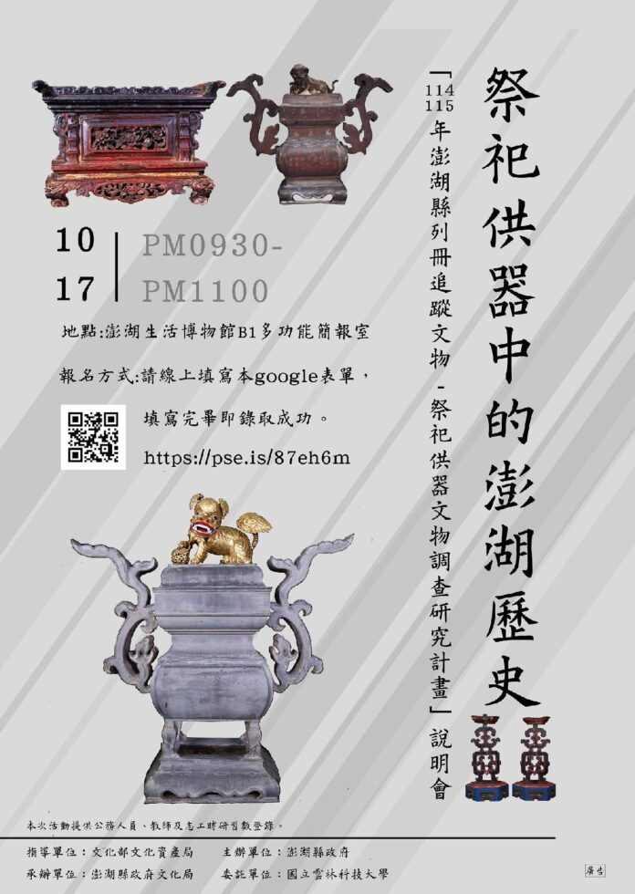 透過這些器物的研究,可以看見澎湖廟宇在社會變遷下的延續與轉化,也讓我們更理解「供器」不只是儀式器物,而是信仰、工藝與社群連結的文化資產。澎湖縣政府文化局誠摯邀請各界關心信仰歷史、傳統工藝、地方文化的朋友一同參與,共同關心這項探索信仰物質文化與社會脈絡的研究成果。