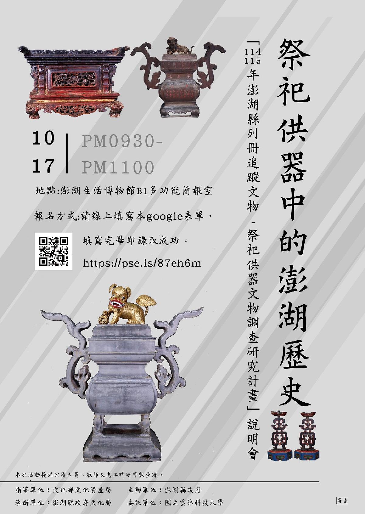 澎湖地區百年歷史廟宇林立,文化資產豐富。自2015年起,澎湖縣政府文化局啟動全縣性文物普查計畫,並於今年委託國立雲林科技大學文化資產維護學系,進行「114-115年澎湖縣列冊追蹤文物—祭祀供器文物調查研究計畫」,由李昱助理教授主持。此計畫聚焦於錫五賽、燭台、神明印等已列冊追蹤的神明供器,深入探討文物背後的工藝史與社會脈絡。將於10月17日(星期五)上午9時30分,在澎湖生活博物館B1多功能簡報室舉辦「祭祀供器中的澎湖歷史-調查說明會」。