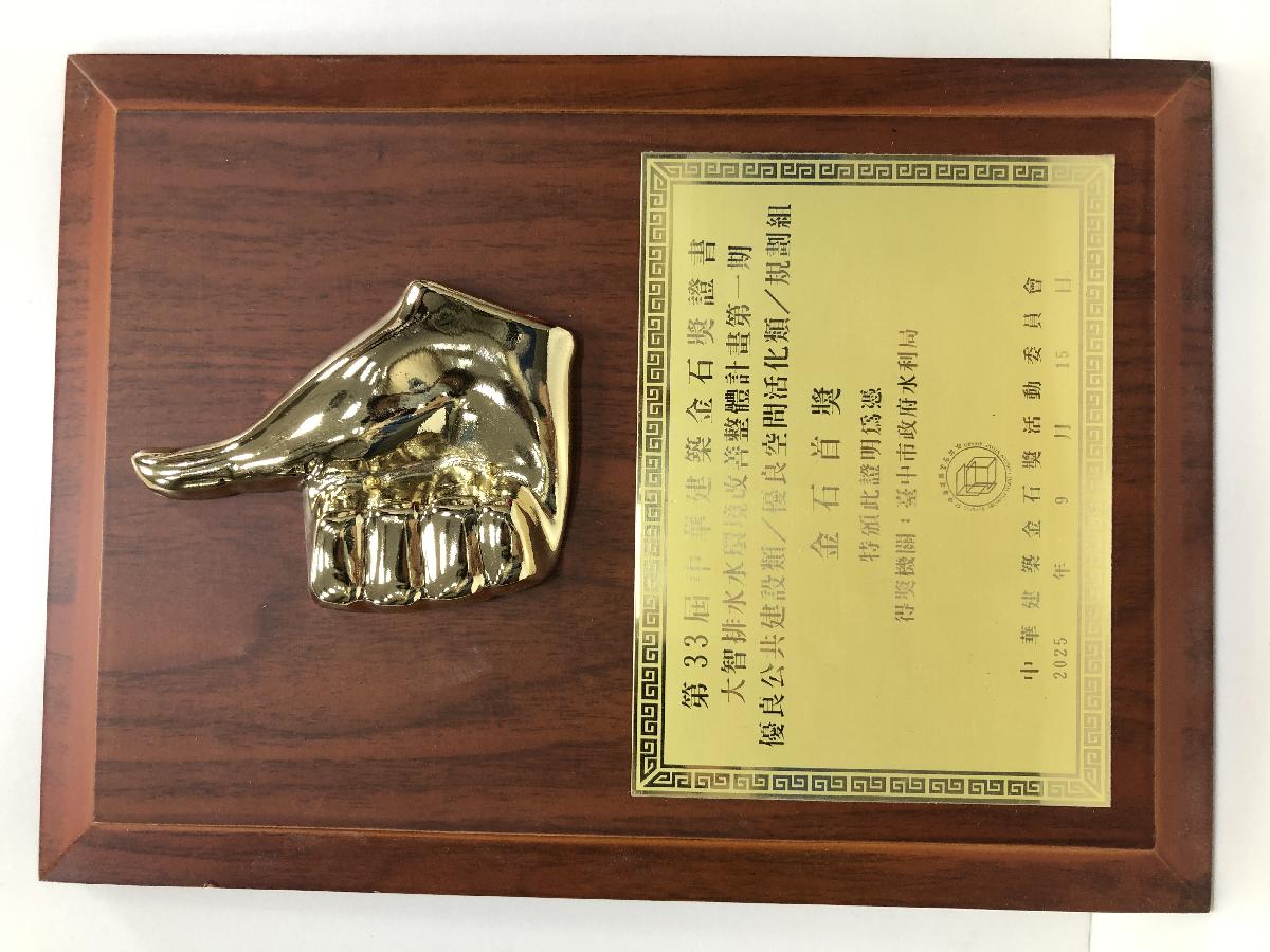 「中華建築金石獎」以台灣品牌自許,長期以來秉持綠色永續經營理念,打造優質人性化的居住環境。台中市水利局今年以「大智排水水環境改善整體計畫第一期」脫穎而出,榮獲第33屆中華建築優良公共工程/優良空間活化類-規劃組「金石首獎」殊榮。此計畫同時也獲得「2024第十二屆台灣景觀大獎」環境規劃類優質獎及「2025國家卓越建設獎」最佳規劃設計類-優質獎,充分展現水利局在水環境營造上的精進與累積成果。