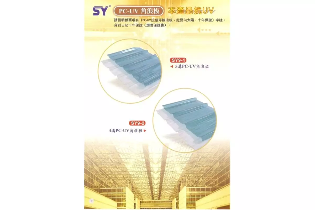 – PC-UV角浪板與大角浪壓片:耐衝擊、抗紫外線,適用於採光罩、天窗及戶外建築設施。