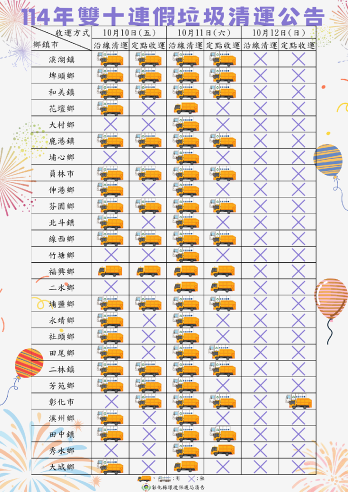 雙十連假期間(10月10日至12日),10月10日國慶日,大村鄉、埔心鄉、竹塘鄉、二水鄉、彰化市、秀水鄉沿線暫停收運,其餘地區沿線照常收運;10月11日全縣沿線照常收運;10月12日適逢例假日,僅彰化市定點有收運。至於光復節連假(10月24日至26日),10月24日,僅溪湖鎮及二水鄉沿線無收運,其餘鄉鎮市沿線照常收運;10月25日光復節當天,大村鄉、竹塘鄉、福興鄉、彰化市、秀水鄉沿線無收運,其餘地區沿線照常收運;10月26日適逢例假日,僅彰化市定點有收運。