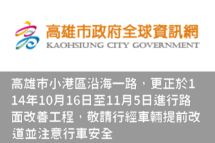 為改善高雄市道路通行品質,工務局道路養護工程處將於10月16日至11月5日進行小港區沿海一路(宏平路至立群路)路面改善。施工時段為晚間9時至隔日晨間6時。另為顧及工程品質,刨鋪後均依施工規範封閉養護6小時以上或溫度降低至50°C以下始開放通車,確保道路使用壽命及品質,如遇天候不佳,將順延一天進場施工。