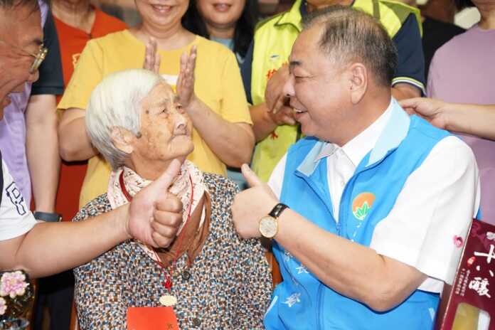 為慶祝114年度九九重陽節,新竹縣副縣長陳見賢於10月13日至10月28日期間,親自前往縣內百歲長輩家中祝賀。今(13)日上午前往竹北市拜訪7位百歲人瑞,最高齡者為102歲的呂范端妹。除了致贈每位人瑞祝賀禮金1萬元、敬老狀,副縣長也親自替人瑞配戴金鎖片,祝福百歲長輩們佳節愉快、健康久久。