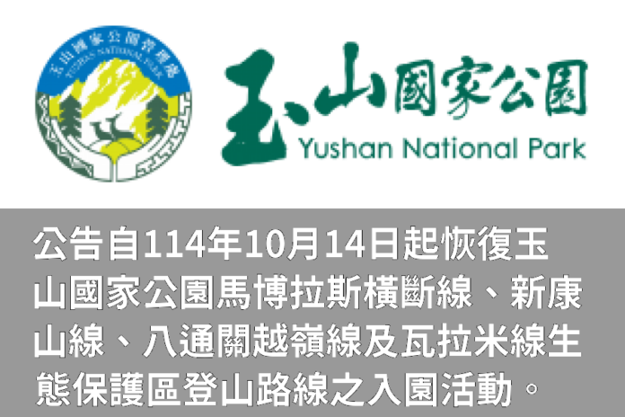 主旨:公告自114年10月14日起恢復玉山國家公園馬博拉斯橫斷線、新康山線、八通關越嶺線及瓦拉米線生態保護區登山路線之入園活動。