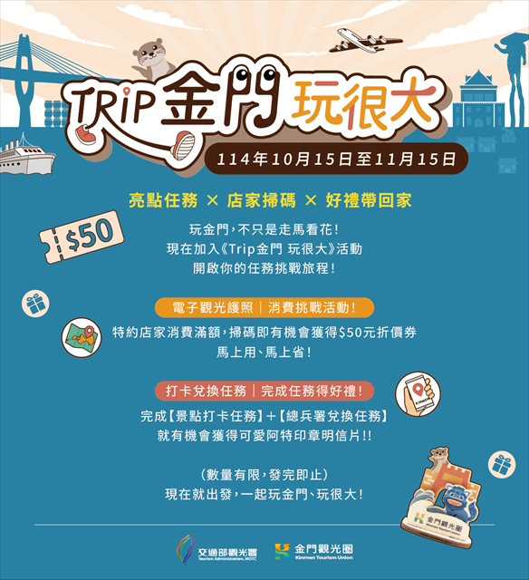 金門秋季旅遊再掀熱潮!「Trip金門玩很大」活動自114年10月15日至11月15日登場,金門觀光圈產業聯盟夥伴共同響應,期望透過整合行銷擴大宣傳,帶動觀光與消費。活動推出「電子觀光護照|消費挑戰活動!」及「打卡兌換任務|完成任務得好禮!」的雙重任務挑戰,讓遊客在暢遊金門拍照打卡的同時,還可以享受滿滿好康。