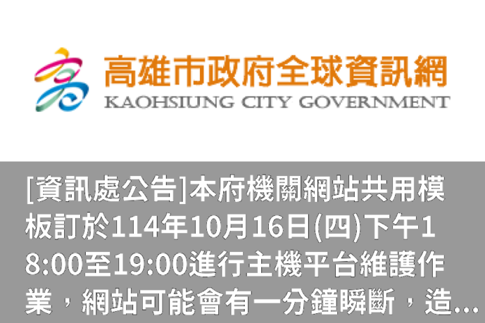 南部新聞高雄市 本府機關網站共用模板訂於114年10月16日(四)下午18:00至19:00進行主機平台維護作業,網站可能會有一分鐘瞬斷,造成不便之處,尚請見諒。 南部新聞高雄市 [資訊處公告] 本府機關網站共用模板訂於114年10月16日(四)下午18:00至19:00進行主機平台維護作業,網站可能會有一分鐘瞬斷,造成不便之處,尚請見諒。 編輯 劉 大龍 2025-10-14 [資訊處公告] 本府機關網站共用模板訂於114年10月16日(四)下午18:00至19:00進行主機平台維護作業,網站可能會有一分鐘瞬斷,造成不便之處,尚請見諒。 延伸閱讀 商情 台灣人魚教練樊繼萱勇闖印度海洋館 Mersoul人魚學校打造追夢舞台! 商情 上《店家日報》,讓客人主動找上門!一篇報導提升曝光、洽詢與搜尋能見度 商情 尚德診所–草屯老人醫學、南投心臟科診所、糖尿病治療 商情 歸仁交通全台貨運物流配送快速專業高效深受企業信賴