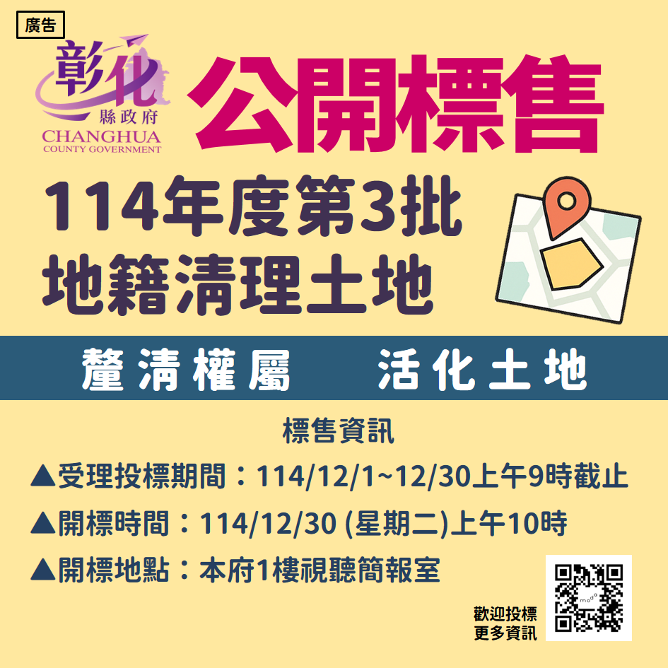 彰化縣政府代為標售114年度第3批地籍清理未能釐清權屬土地,自即日起至114年12月26日止公告3個月,受理投標期間為114年12月1日起至114年12月30日上午9時止,並訂於114年12月30日(星期二)上午10時辦理開標作業,本次共公告23標土地,歡迎有意投標且符合投標資格的民眾踴躍參與投標,以免向隅。