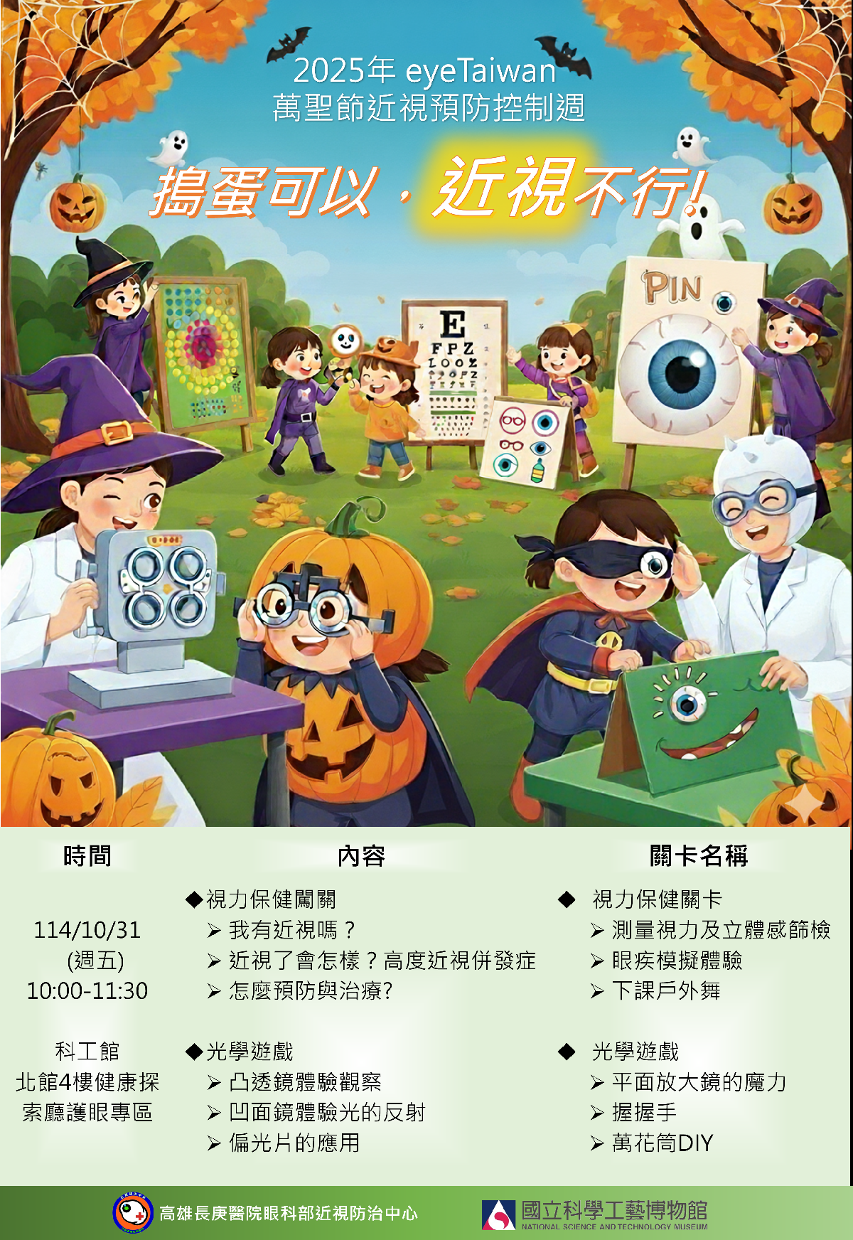今(114)年10月31日萬聖節,高雄長庚近視防治中心將與本館合作舉辦「搗蛋可以,近視不行」活動,擴大推廣近視預防與控制。當天上午邀請科工幼兒園小朋友以萬聖節裝扮於健康探索廳護眼專區旁長廊參與視力保健闖關與光學遊戲,希望透過活動讓家長與小朋友了解近視是個病,並開始積極預防與治療,守護自身健康。