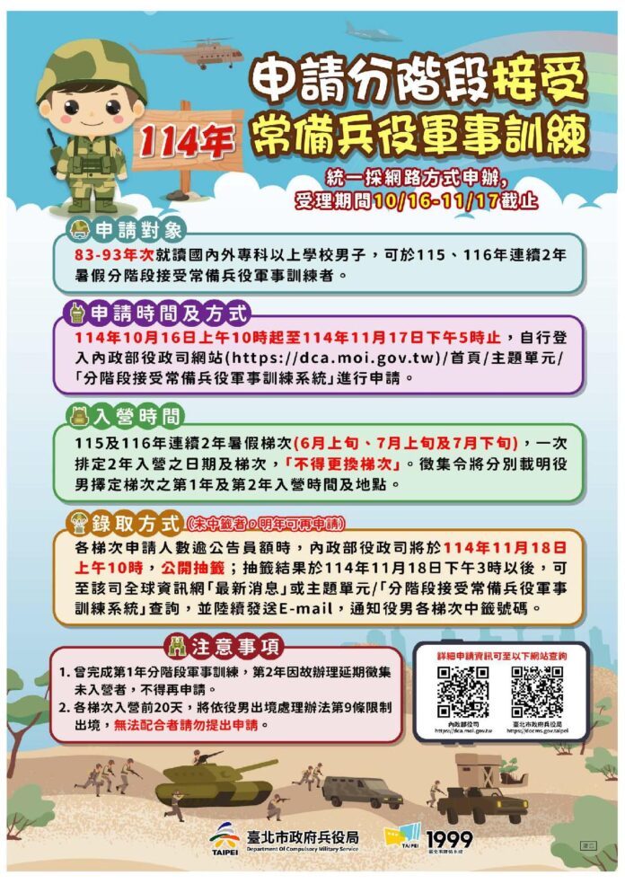 臺北市政府兵役局表示,依內政部公告今年申請暑期分階段常備兵役軍事訓練,國防部提供3個陸軍軍事訓練入營梯次,各梯次入營日期及錄取員額分別為:第一梯次115年6月8日入營(200員額);第二梯次115年7月7日入營(800員額);第三梯次115年7月28日入營(200員額)。由於每個梯次受訓期間不同,役男於申請前請務必詳閱公告事項,並根據個人行程選擇合適梯次。另各梯次申請人數未超過錄取員額時,全額錄取;如申請人數逾錄取員額時,該超額梯次內政部役政司將於114年11月18日上午10時,公開辦理抽籤。