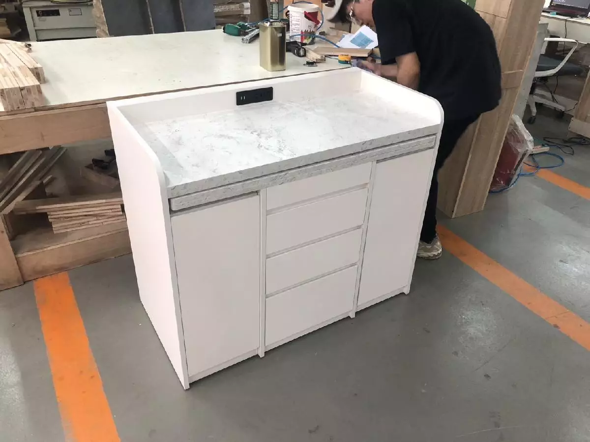 師傅笑著說:「變形茶几看起來簡單,其實最考驗功夫。只要螺絲鎖偏一點點,就得全部重來。」